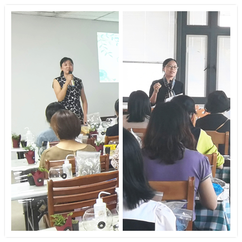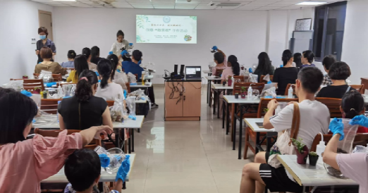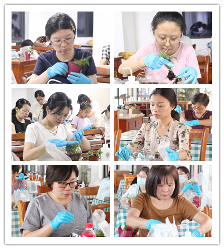 活动伊始,播放的关于《梁启超家书》选编的视频立刻吸引了大家的目光,大家从视频感知到了好的家风家训对于家庭的重要性,对于传承中华文化价值观的现实意义。带着对如何养成良好家风家训的思考,在场教职工们跟随花艺师的讲解,发挥想象、尽显创意,把对伟大祖国的热爱和对美好生活的赞美通过灵巧双手表达在自己手中的微景观上,活动现场充满温馨和希望。