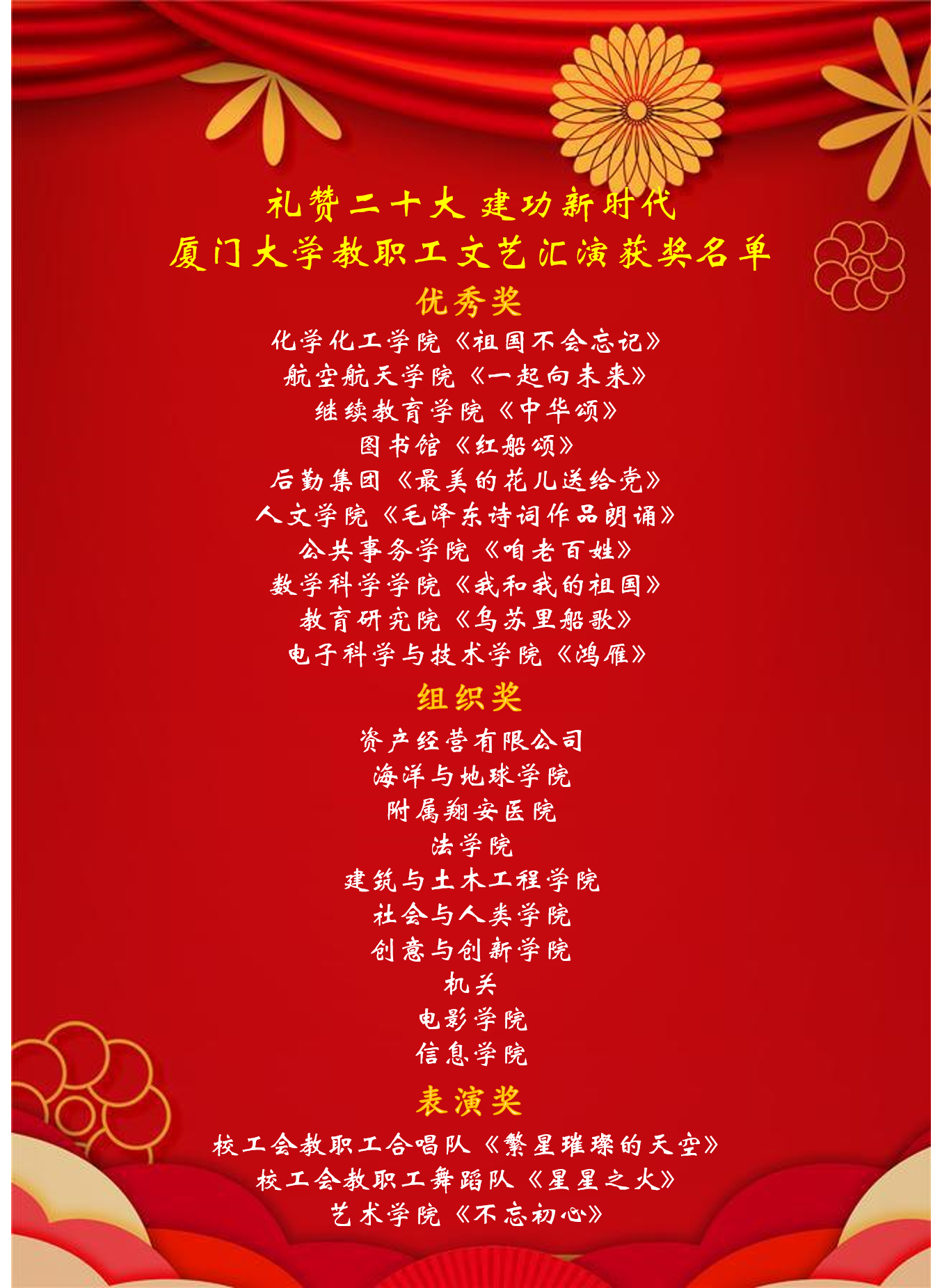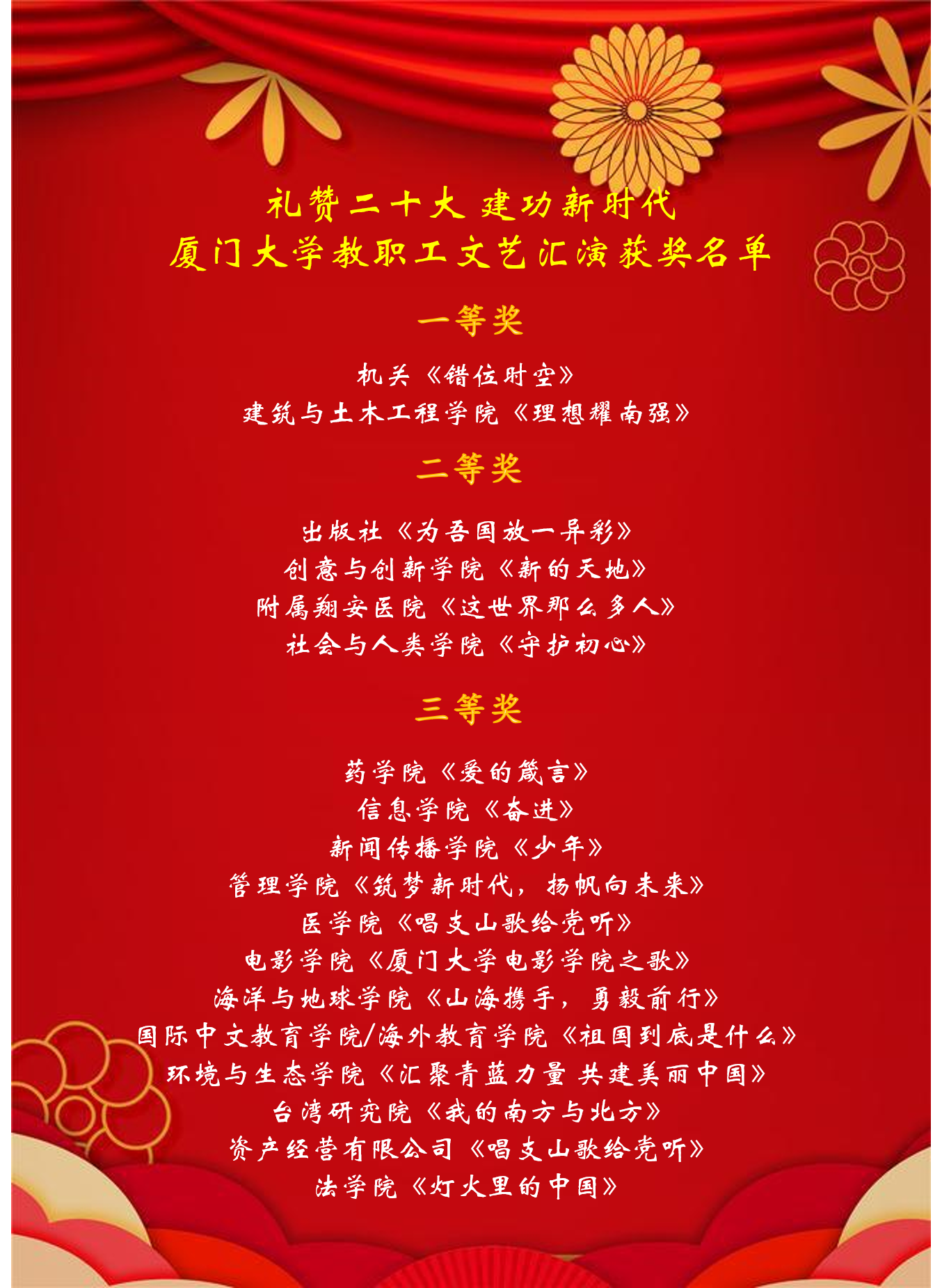 经过评比,机关、建筑与土木工程学院荣获一等奖,出版社、创意与创新学院、附属翔安医院、社会与人类学院获二等奖,12个单位获三等奖,10个单位获优秀奖。资产经营有限公司、海洋与地球学院、附属翔安医院、法学院、建筑与土木工程学院、社会与人类学院、创意与创新学院、机关、电影学院、信息学院荣获组织奖。