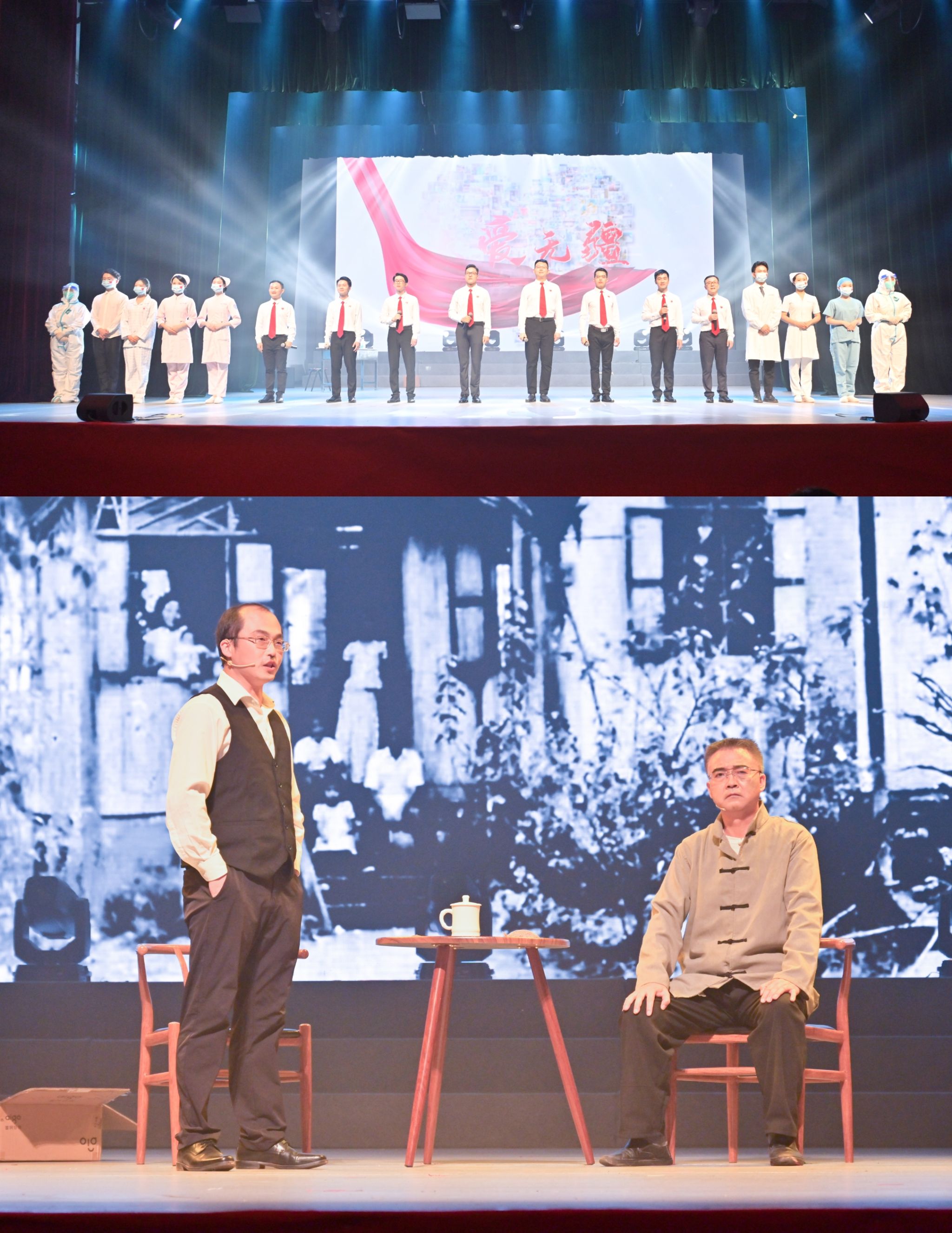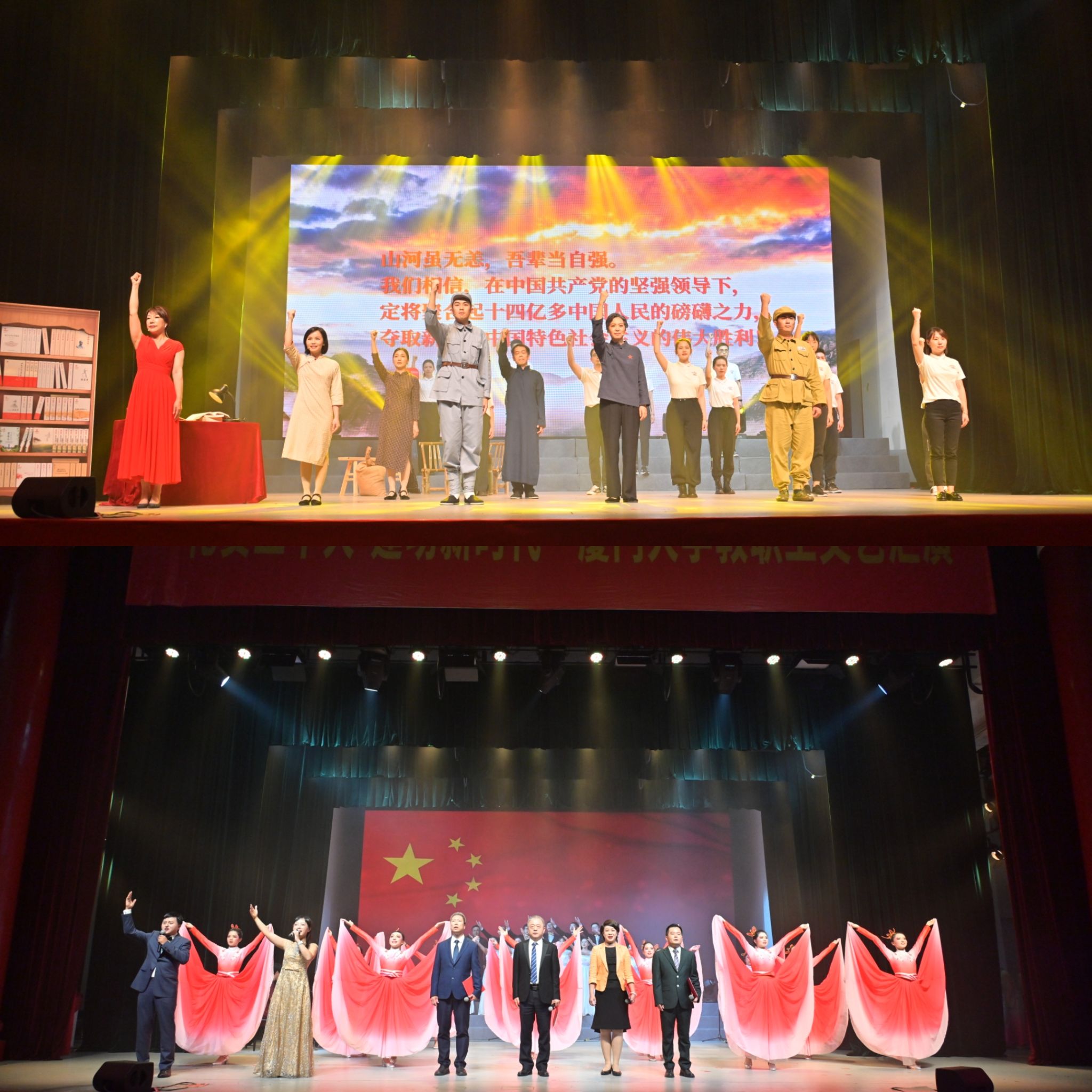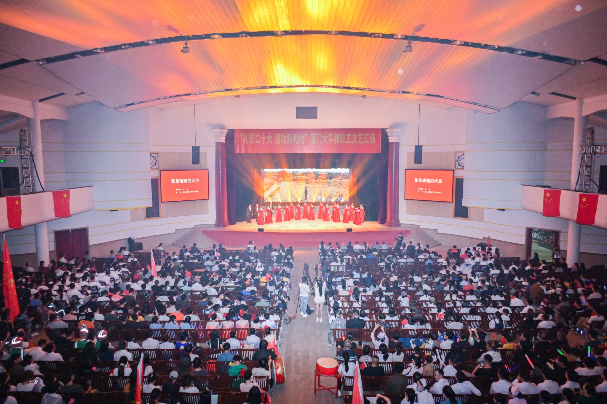 建南大会堂内,3000多位师生精神振奋,灯光绚丽璀璨,气氛庄重热烈。一首由教职工艺术团合唱队带来的《繁星璀璨的天空》拉开了演出帷幕。通过合唱、歌舞、朗诵、情景剧等多种艺术表现形式,教职工们以最饱满的热情把对党的爱融入到表演中,以最炙热的方式表达对党、对祖国、对人民最美好的祝愿。一首首动人的歌曲唱出了属于厦大人的深情,一个个感人的故事赞美着身边那些平凡而伟大的人,一支支欢快的舞蹈展现了我校教职工踔厉奋发、勇毅前行的饱满精神;一个个灵动的舞姿,一句句铿锵的朗诵,一声声真情的歌唱,将理论宣讲与艺术相融合,热情讴歌新时代伟大成就,凝聚奋进新征程的磅礴力量,彰显我校师生自信自强、昂扬向上、踔厉奋发、团结奋斗的精神风貌,与祖国共奋进、谱写新华章的使命与担当。