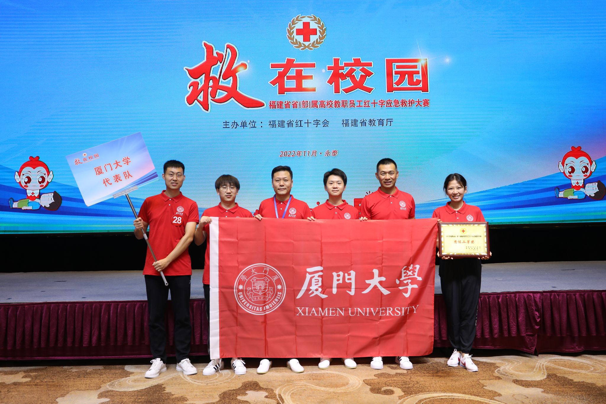 本次大赛以“救在校园”为主题,比赛分为个人赛和团体赛,内容包含成人心肺复苏(含AED使用)操作、创伤救护(左前臂出血现场止血包扎)实操两项内容。校红十字会联合校医科建设与管理办公室及校工会积极开展报名选拔,最终由张佳坡领队、郑达雄、张贵、钟奎、何涛、付歆欣五名队员组成参赛队伍。经过前期集中实操训练及现场激烈角逐,厦门大学代表队凭借扎实的专业素养、精湛娴熟的操作技能荣获团体二等奖,队员张贵获心肺复苏一等奖、个人综合二等奖、创伤救护三等奖,队员何涛获心肺复苏三等奖。
