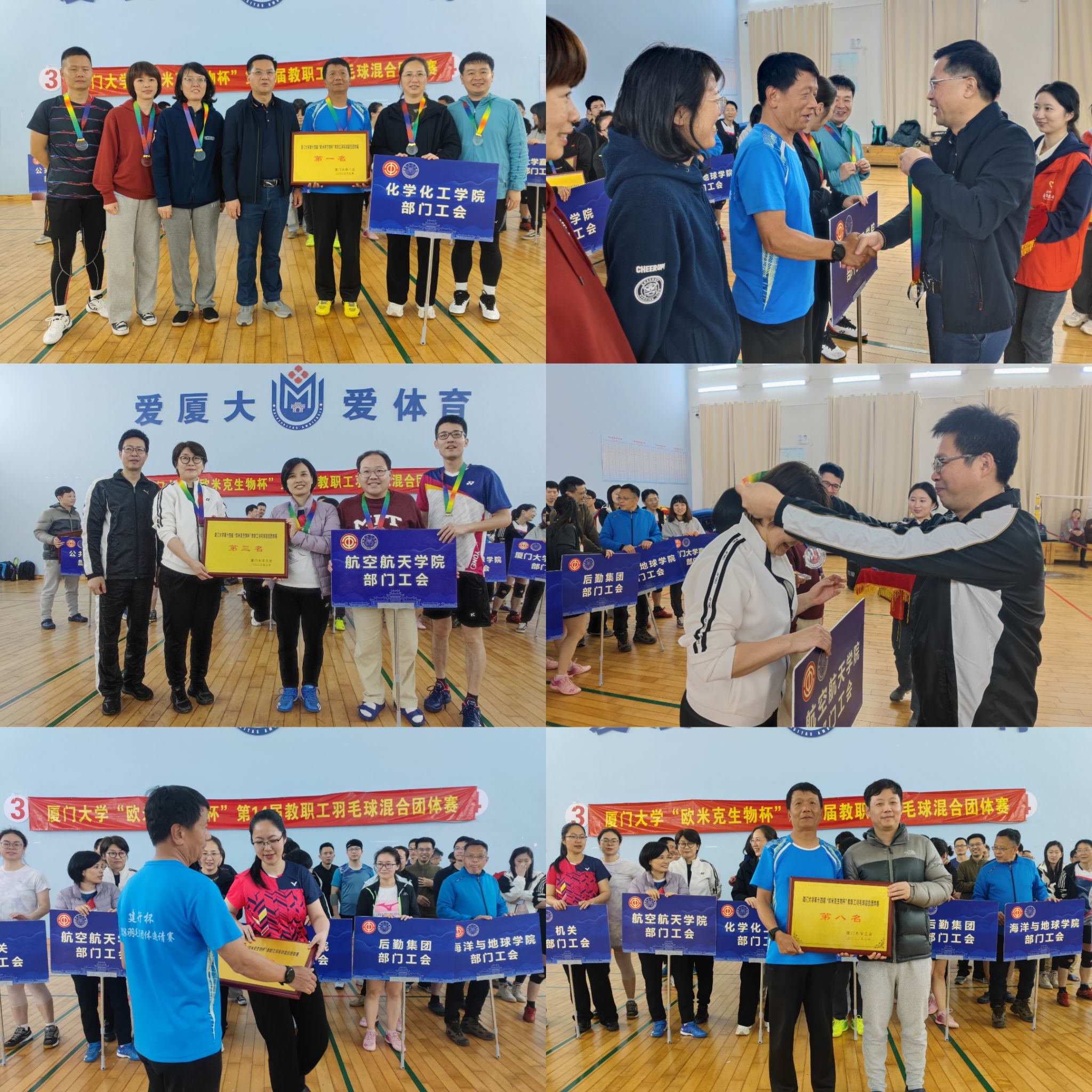 校工会副主席余炳建,材料学院院长、校教职工羽毛球协会会长解荣军,原教职工羽毛球协会会长林敏为获得前八名队伍颁奖。