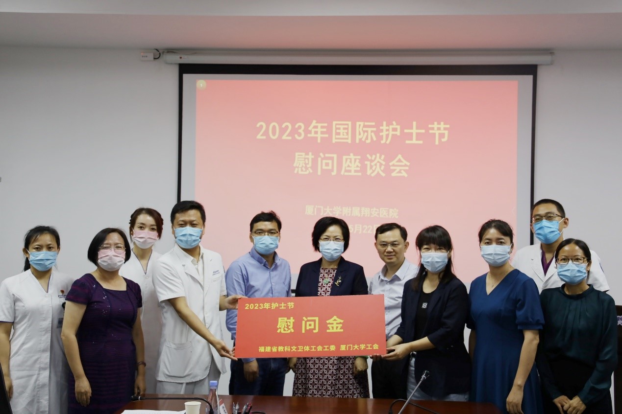 5月22日上午,厦门大学党委常委、副校长、校工会主席邓朝晖,厦门大学工会常务副主席洪秋霞,校工会副主席茹晓燕,校工会副主席、校妇委会主任陈小芬一行前往附属翔安医院,关心慰问护理人员,并送上省教科文卫体工委工会、学校工会的关怀。院党委书记左正宏、执行院长何伟玲、党委副书记傅万里、护理部副主任张佳坡及护士代表参加座谈会。会议由医院党委副书记傅万里主持。
