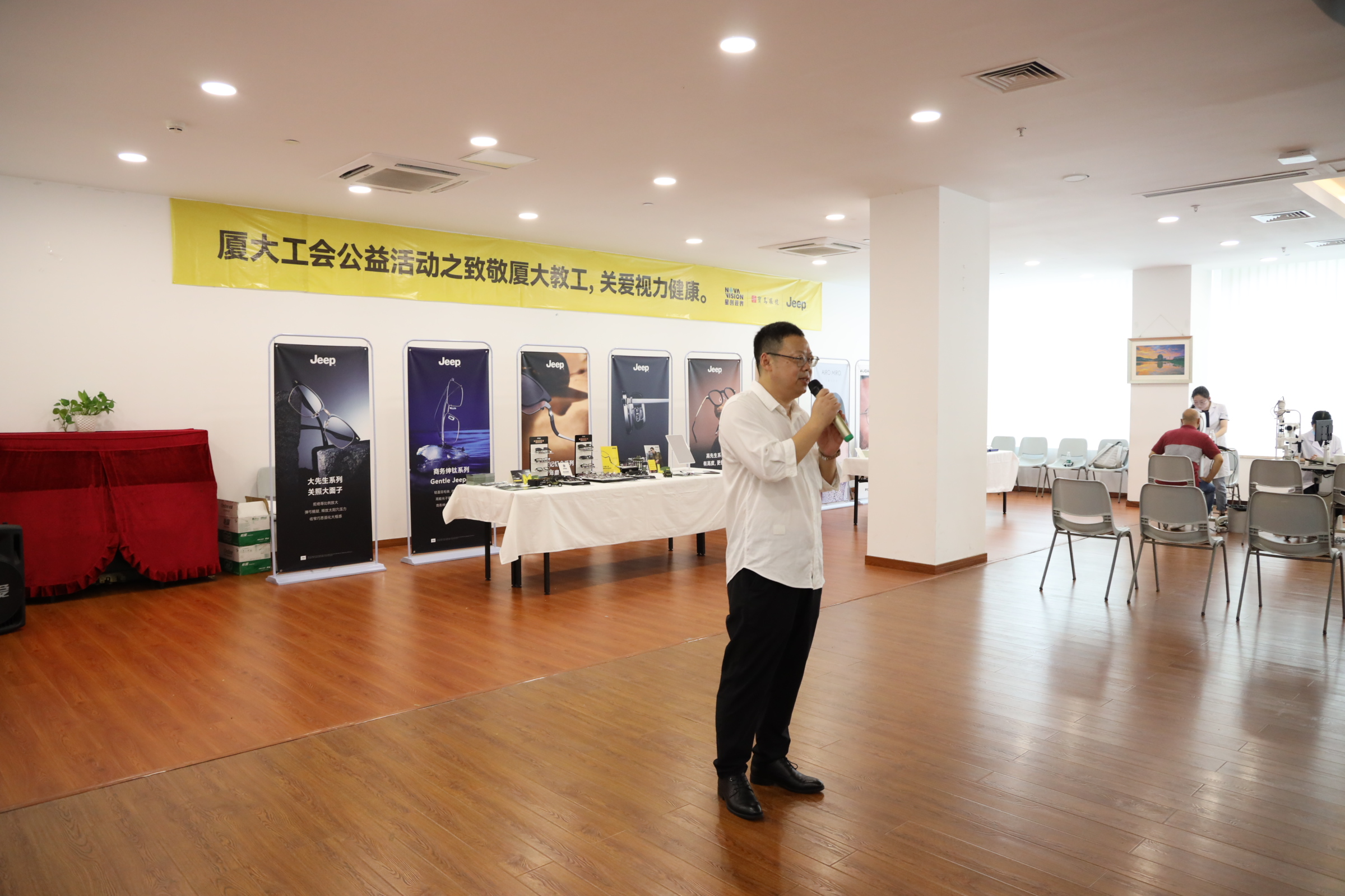 为深入学习贯彻新工会法精神,竭诚服务教职工,贴近教职工办实事,关心和帮助教职工养成良好的用眼习惯、科学配戴眼镜,6月12-16日,校工会、星创视界、宝岛眼镜和Jeep眼镜在厦门大学思明校区教工活动中心(建文楼一楼)共同举办“致敬厦大教工 关爱视力健康”公益活动。校工会副主席余炳建,Jeep眼镜董事长孙开悦,Jeep眼镜总经理马瑜,星创宝岛眼镜副总经理张良,教职工代表和企业职工代表等出席了活动开幕式。