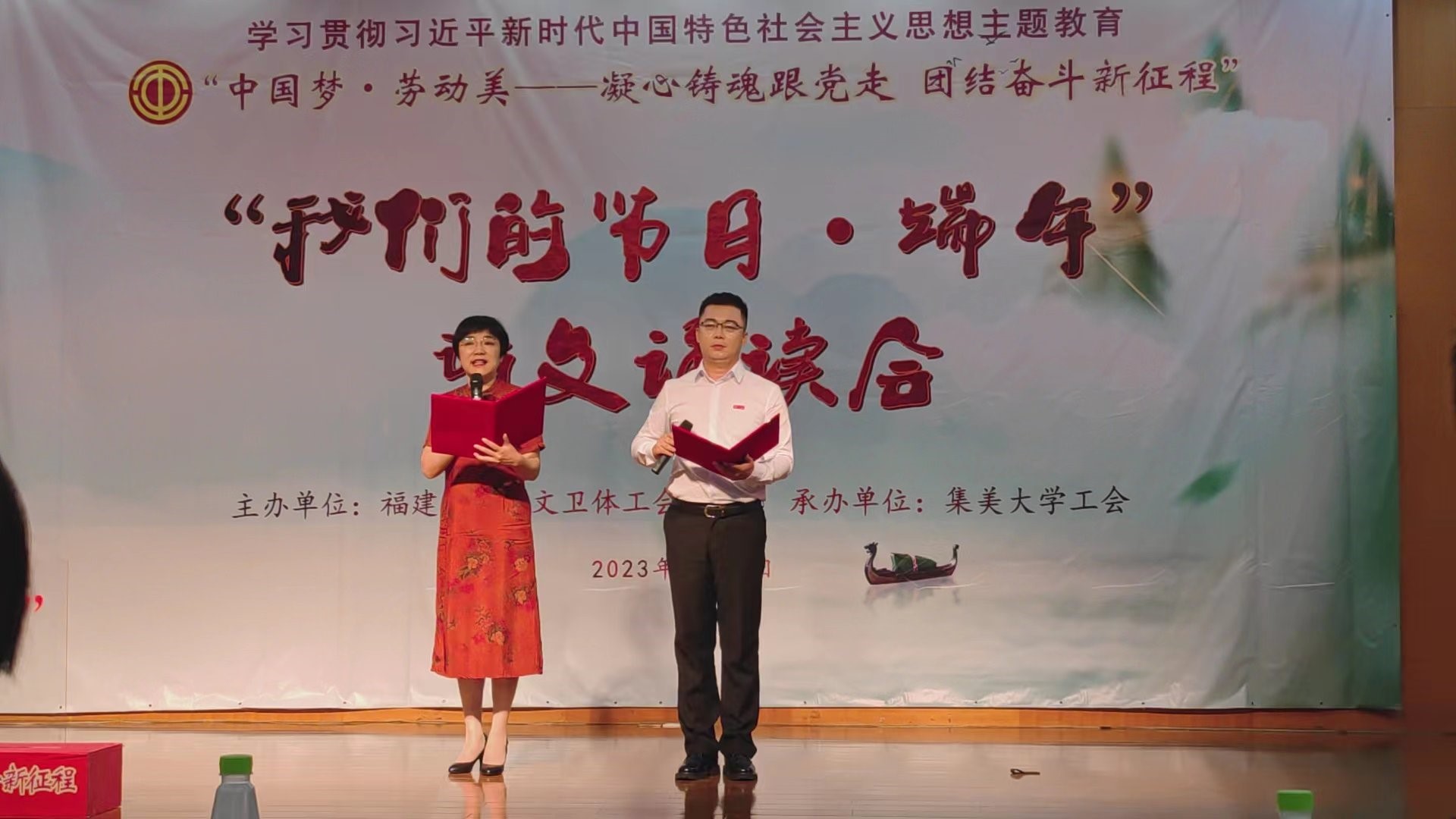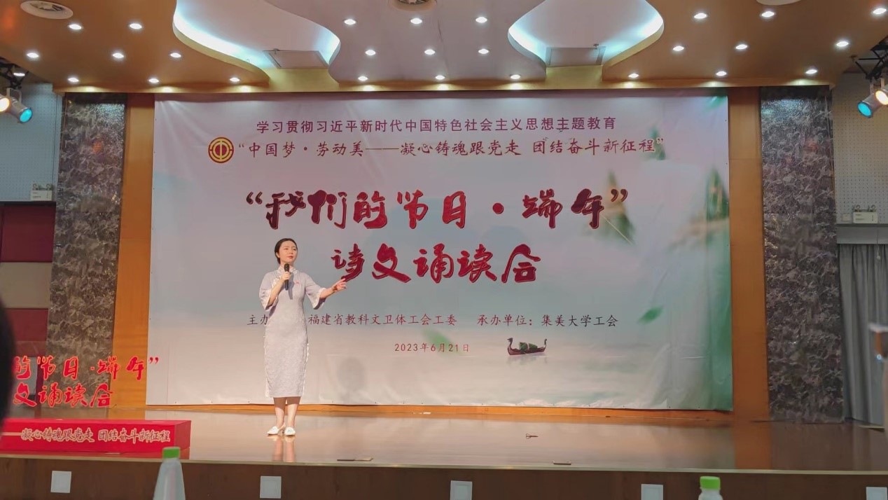 为深入开展学习贯彻习近平新时代中国特色社会主义思想主题教育,推进“新思想飞入寻常百姓家”,6月21日上午,由省教科文卫体工会工委主办、集美大学工会承办的“中国梦•劳动美——凝心铸魂跟党走 团结奋斗新征程”暨“我们的节日•端午”诗文诵读会在集美大学举办,省教科文卫体工会工委一级调研员苏龙出席活动,校工会副主席余炳建、茹晓燕,校教职工朗诵艺术协会会长楼红英带队参加活动。
