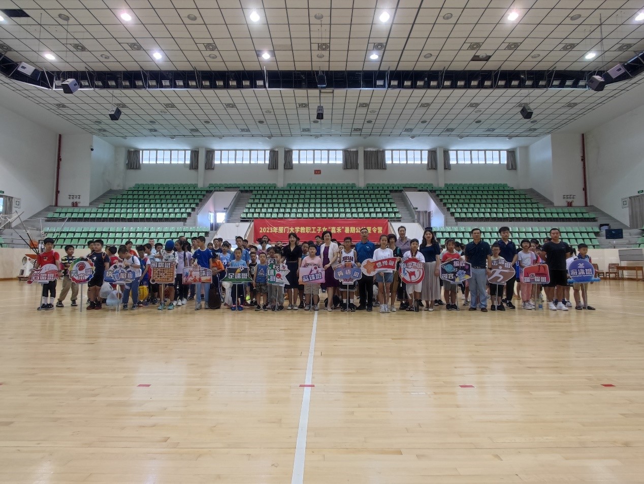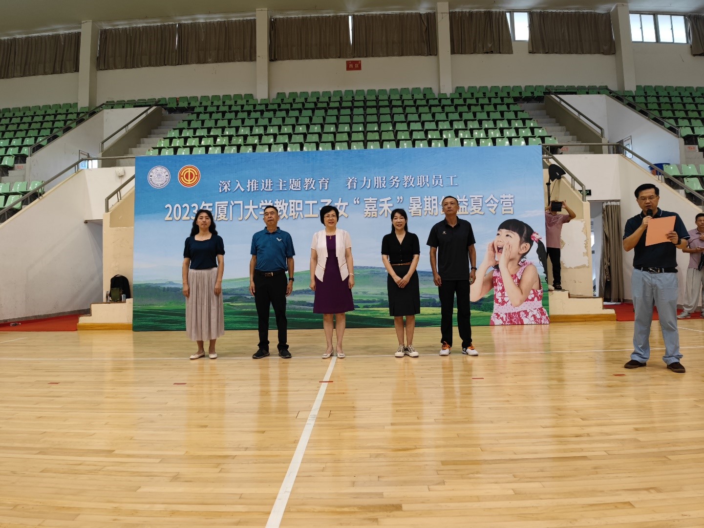 7月6日上午, 2023年厦门大学教职工子女“嘉禾”暑期公益夏令营开营仪式在思明校区明培体育馆举行。厦门大学党委常委、副校长、工会主席邓朝晖,校工会常务副主席洪秋霞,体育教学部党委书记郑树东,校工会副主席茹晓燕,校工会常委王鹏,夏令营培训班教师代表、家长代表、学员代表参加开营仪式。开营仪式由校工会副主席余炳建主持。