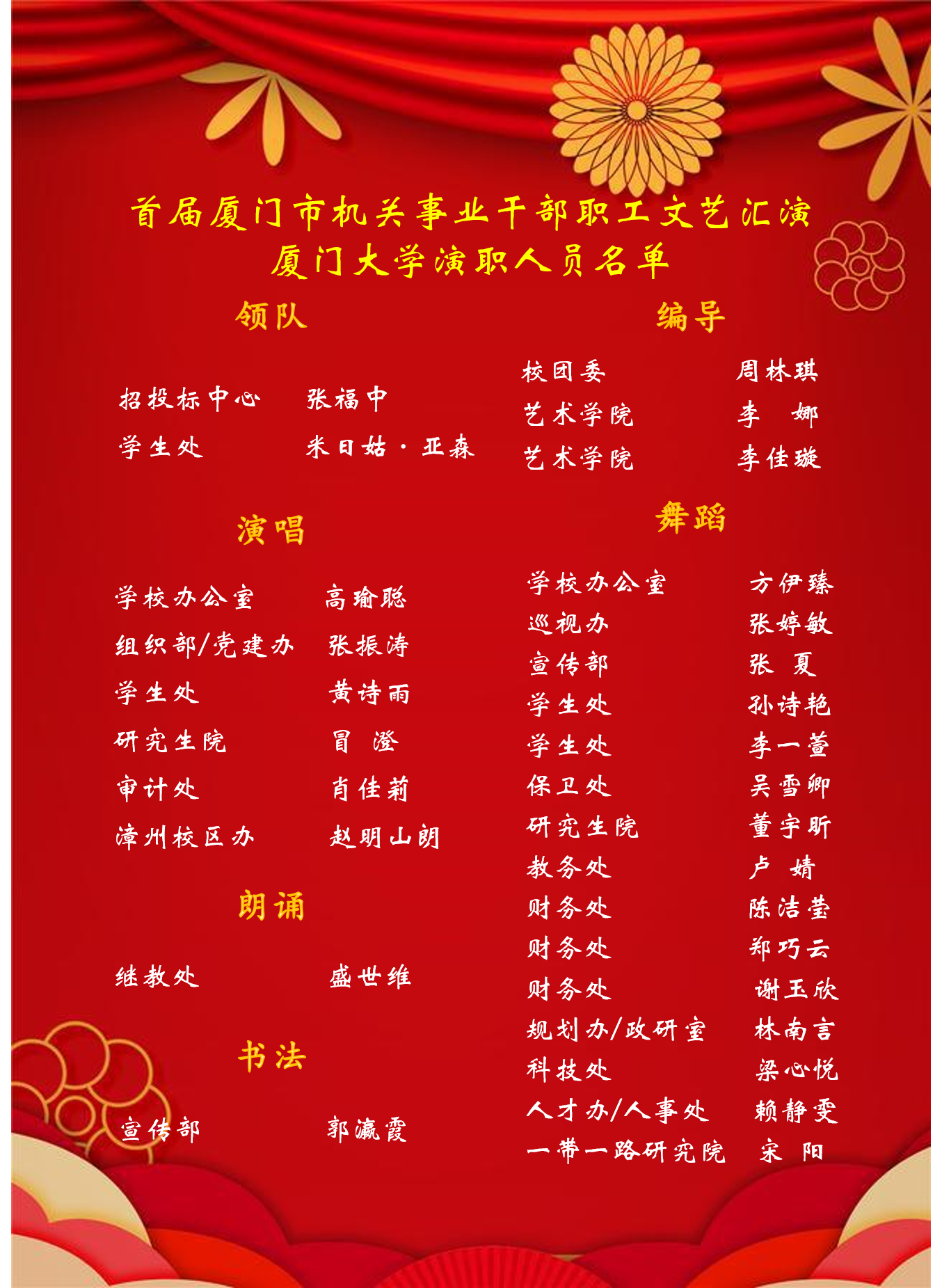 本次文艺汇演共有来自市直机关工联会直属基层工会、系统工会选送的朗诵、戏曲、快板、琵琶、歌舞类型等13个节目参加,上演了一台高水准高质量的文艺汇演。为展示我校教职工精神风采,我校组织机关工会干部参加此次汇演,校工会副主席余炳建带队,我校获优秀组织单位。
