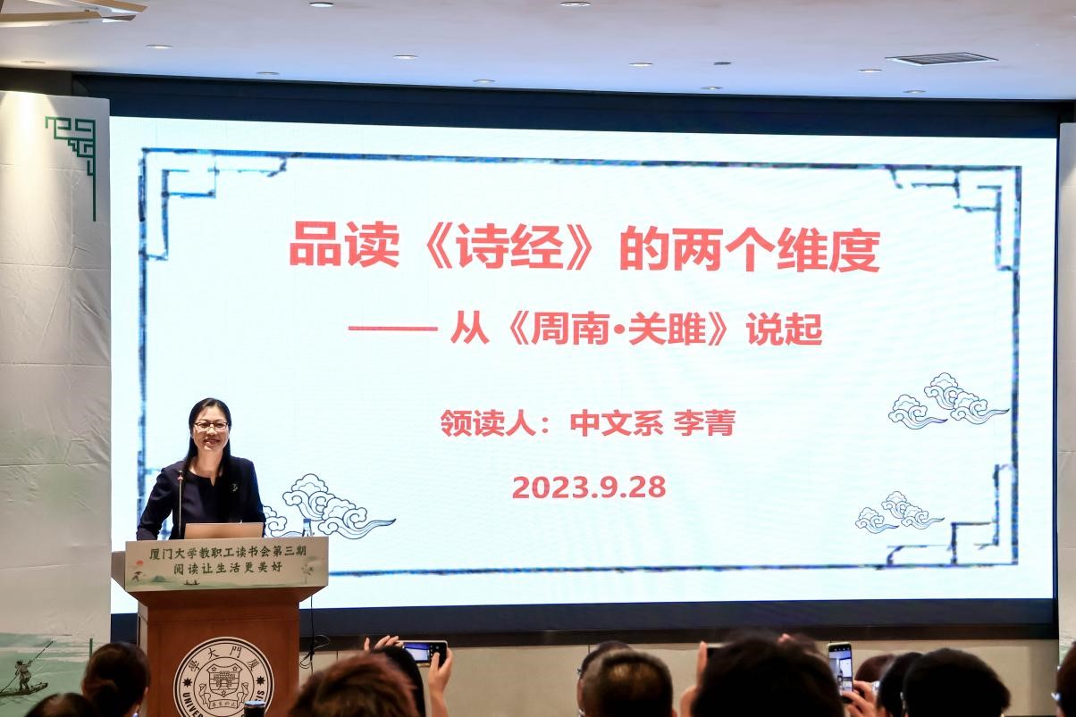 本期读书会特邀厦门大学中国语言文学系副教授,获评厦门大学“最受欢迎女教师”、“我最喜爱的十位老师”等荣誉称号,并多次在《百家讲坛》担任主讲人的李菁老师担任领读人。李菁以 “品读《诗经》的两个维度——从《关雎》说起”为主题,从“温故而知新——《诗经》是什么?”“打开《诗经》的正确方式——以《关雎》为例”以及“无法抗拒的《诗经》文学之美”三个方面出发,带领在场师生共同品读《诗经》,在欣赏佳篇秀句的同时,探求《诗经》曾经具有过的政教功能和道德意义,获知古人对于社会、家庭、人生、伦理的观念态度乃至对于后世文化的巨大影响。