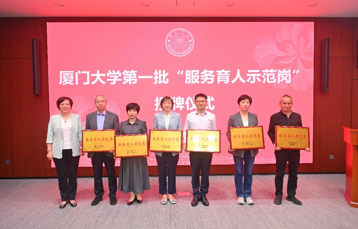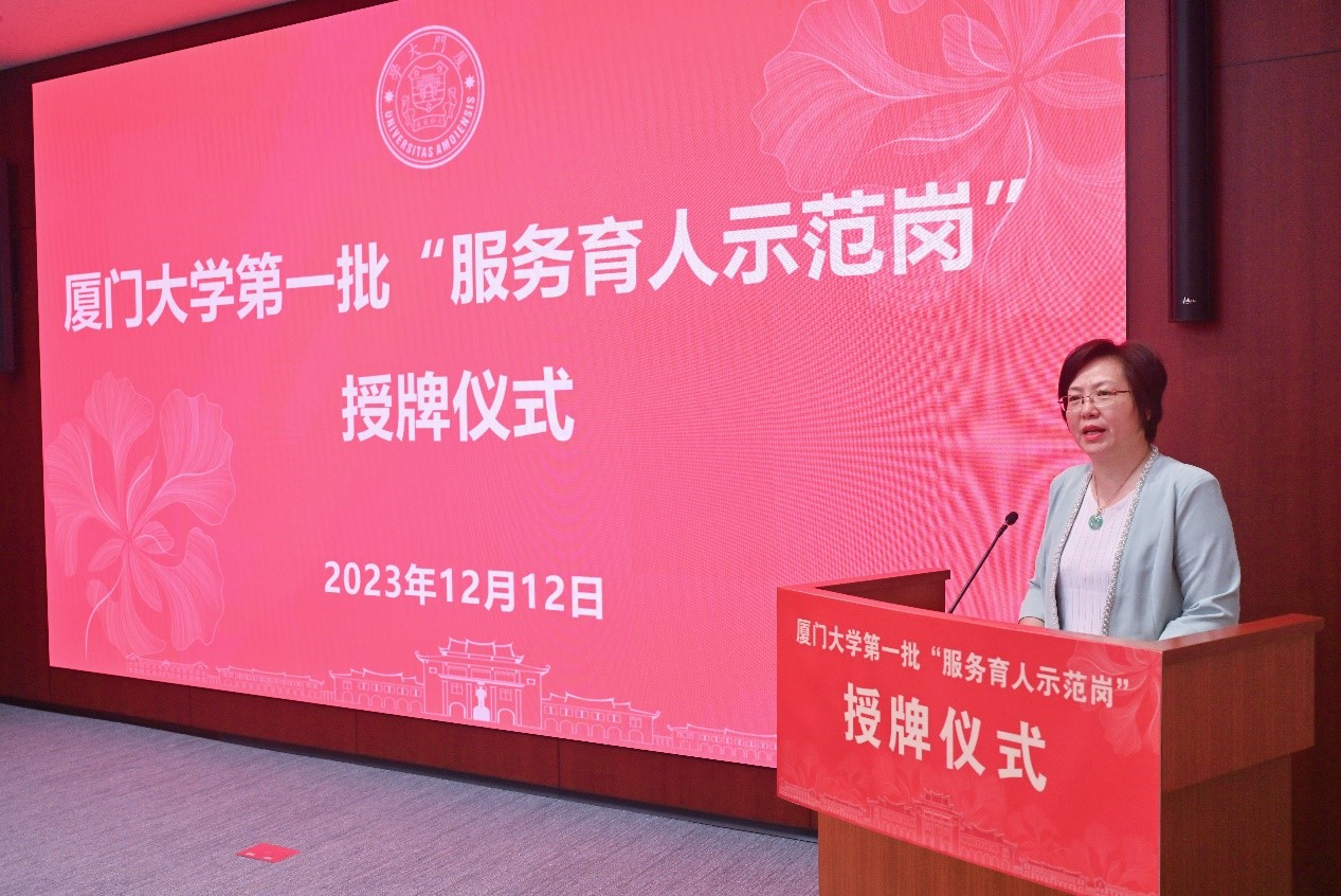 厦门大学党委常委、副校长、工会主席邓朝晖,厦门大学工会常务副主席洪秋霞为厦门大学第一批“服务育人示范岗”单位集体(个人)进行授牌。