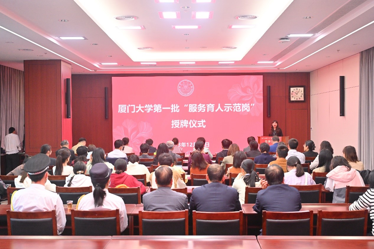 十年树木,百年树人。为落实立德树人根本任务,完善服务育人体制机制,将服务育人内化于心,外化于行,弘扬厦门大学优良校风,树立育人先进典型模范,为服务育人发挥典型示范作用。厦门大学“三全育人”综合改革工作小组秘书处、厦门大学工会于2023年12月12日上午,在颂恩楼220会议室举办厦门大学第一批“服务育人示范岗”授牌仪式。厦门大学党委常委、副校长、工会主席邓朝晖、厦门大学“三全育人”综合改革工作小组组长单位领导、厦门大学第一批“服务育人示范岗”的领导及个人和师生代表参加了本次授牌仪式。授牌仪式由校工会副主席茹晓燕主持。