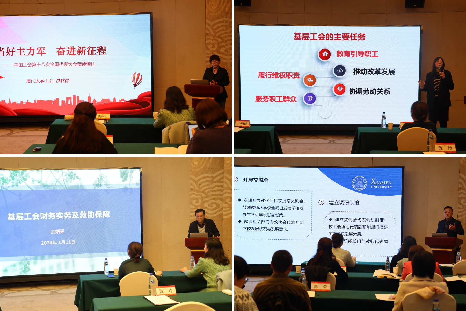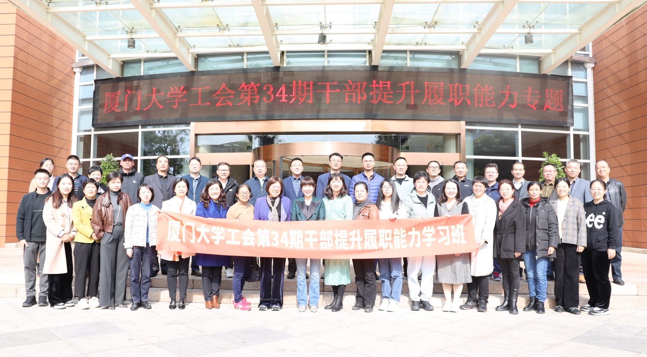 1月11日至12日,为期两天的厦门大学工会第34期干部提升履职能力学习班在全总厦门劳模疗休养中心(厦门杏林湾大酒店)举行,校工会常务副主席洪秋霞,校工会副主席余炳建、茹晓燕、蔡伟毅出席会议,校工会委员、经审委员、各学院工会主席参加本次学习班并交流研讨。