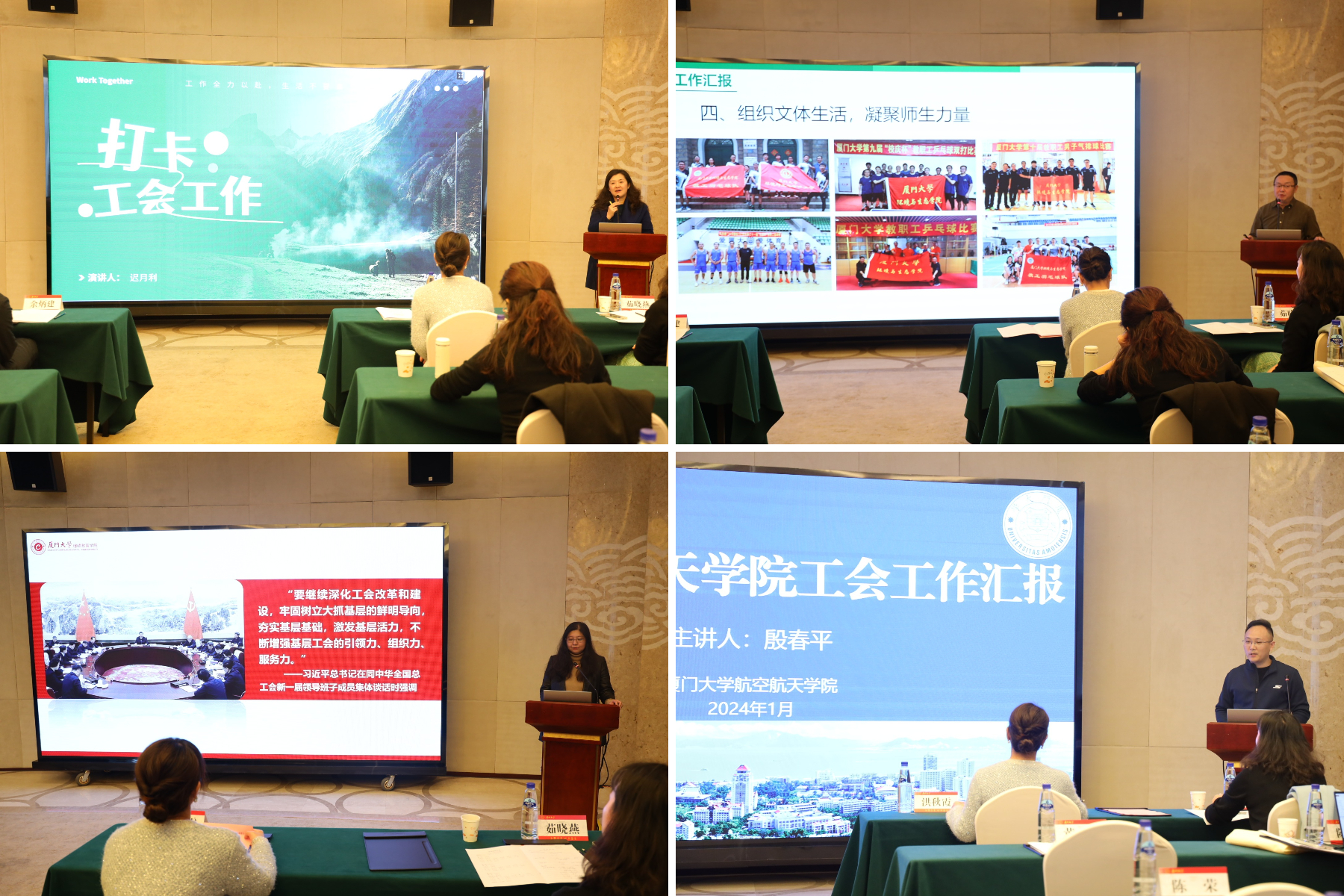 在各学院工会主席工作交流汇报环节,新闻传播学院分工会主席迟月利作“打卡工会工作”分享,环境与生态学院分工会主席陈荣从理工科角度介绍工会特色工作,继续教育学院分工会主席肖佳以“枝叶关情、点滴润心”为题分享如何建好继教之“家”,航空与航天学院分工会主席殷春平介绍了学院分工会新换届以来对于工会工作的看法和理念。