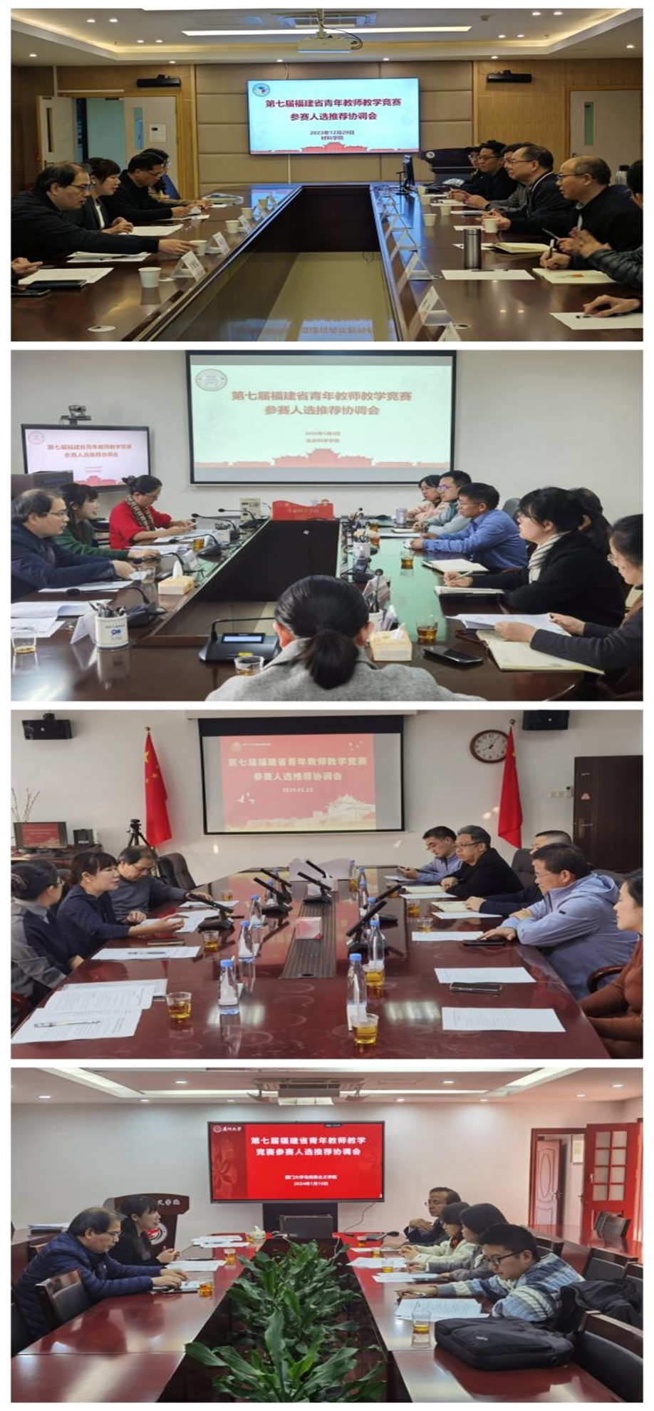 为深入学习贯彻习近平新时代中国特色社会主义思想,贯彻落实党的二十大精神和中国工会十八大精神,推动我校高水平教师队伍建设,备战第七届福建省高校青年教师教学竞赛,2023年12月29日至2024年1月10日,校工会、教师发展中心、教务处等第七届福建省高校青年教师教学竞赛组织委员会单位前往材料学院、生命科学学院、新闻传播学院、马克思主义学院开展了4场第七届福建省高校青年教师教学竞赛参赛人选推荐协调会。