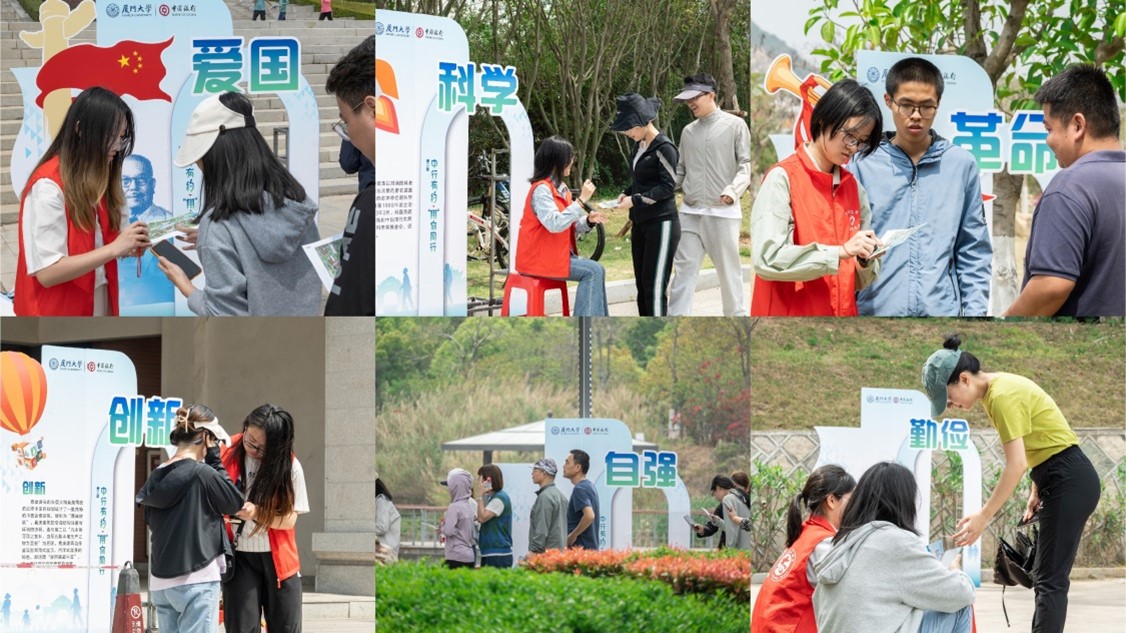 本次活动起终点均设于德旺图书馆南广场嘉庚像前,途经文宣楼、跃进楼北侧、教工食堂南侧、航空航天学院南广场、三角梅广场、环生楼西侧、学武楼东侧等多个打卡点。打卡点分别以 “忠公、诚毅、勤俭、创新”的 嘉庚精神和“爱国、革命、自强、科学”的厦大校风为主题。参赛的各民族师生在打卡点处集章、答题,在拍照墙前合影留念。健步行过程中,师生们意气风发、挥洒汗水,展现了厦大人热情饱满的精神风貌和奋发进取的精神力量。