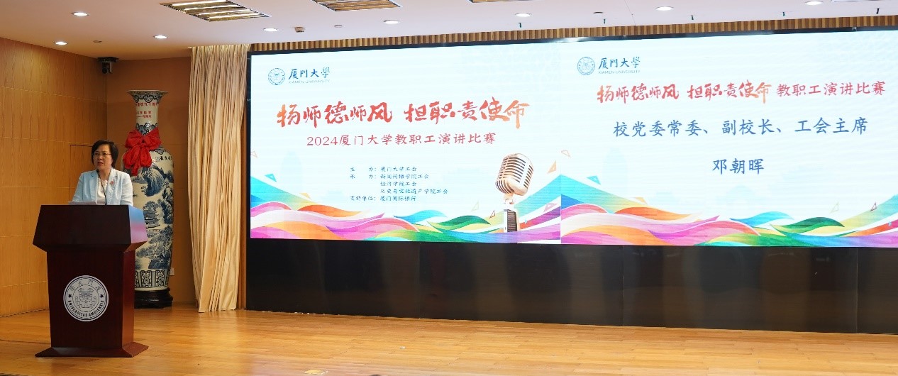 校党委常委、副校长、工会主席邓朝晖代表学校向比赛的顺利举办表示热烈的祝贺。她指出,师德师风建设的根本目的是为了提高教育质量,培养优秀人才,也是嘉庚先生的建校初心。今年是嘉庚先生诞辰150周年,希望我校教职工牢记习近平总书记的嘱托,传承和发扬嘉庚精神,坚持教书和育人相统一,坚持言传和身教相统一,坚持潜心问道和关注社会相统一,坚持学术自由和学术规范相统一,为学校的科学发展提供强大的精神动力,扎实推进世界知名的高水平研究型大学建设。