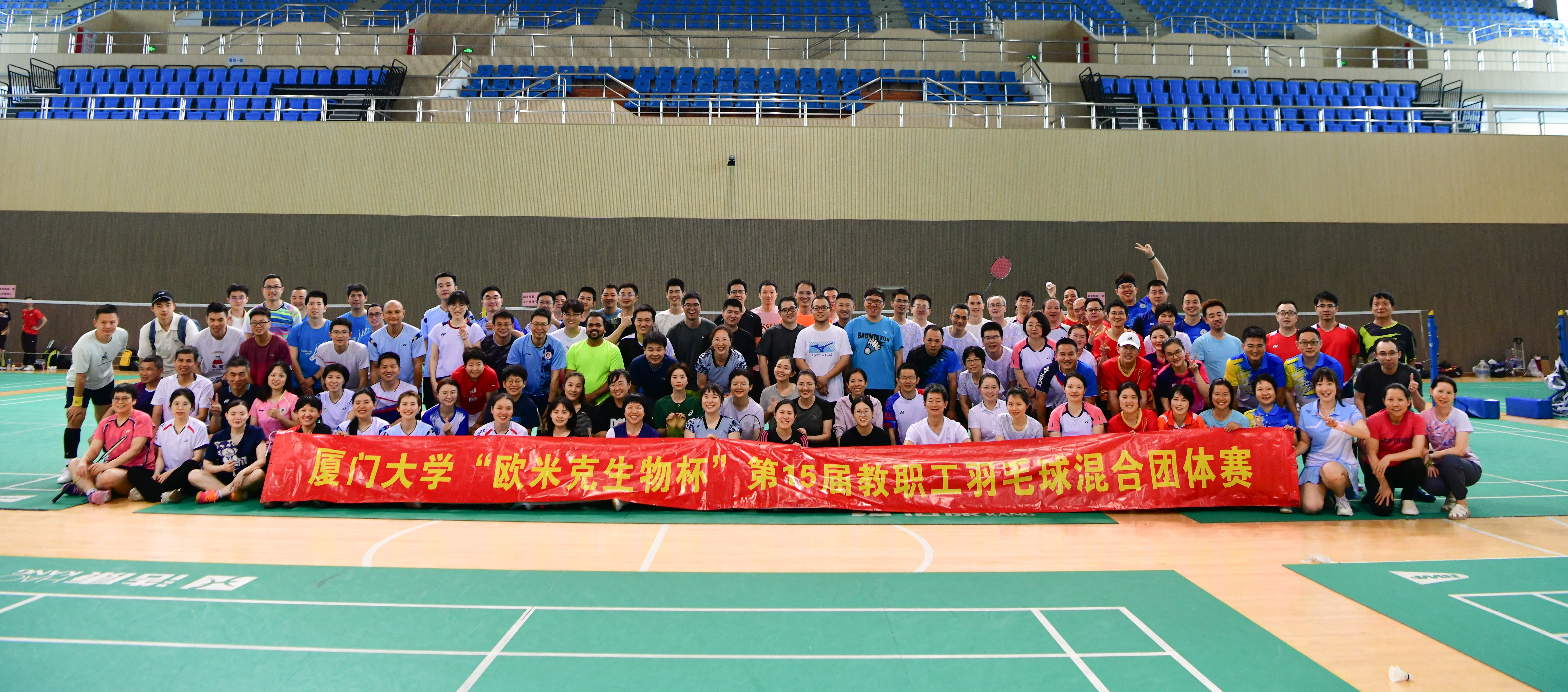 为深入学习贯彻党的二十大精神、习近平总书记关于全民健身、健康中国的重要论述和中国工会十八大精神,深入实施全民健身国家战略,4月20日至21日,由校工会主办、校教职工羽毛球协会承办的厦门大学第十五届“欧米克生物杯”教职工羽毛球混合团体赛在思明校区风雨球馆圆满落幕。