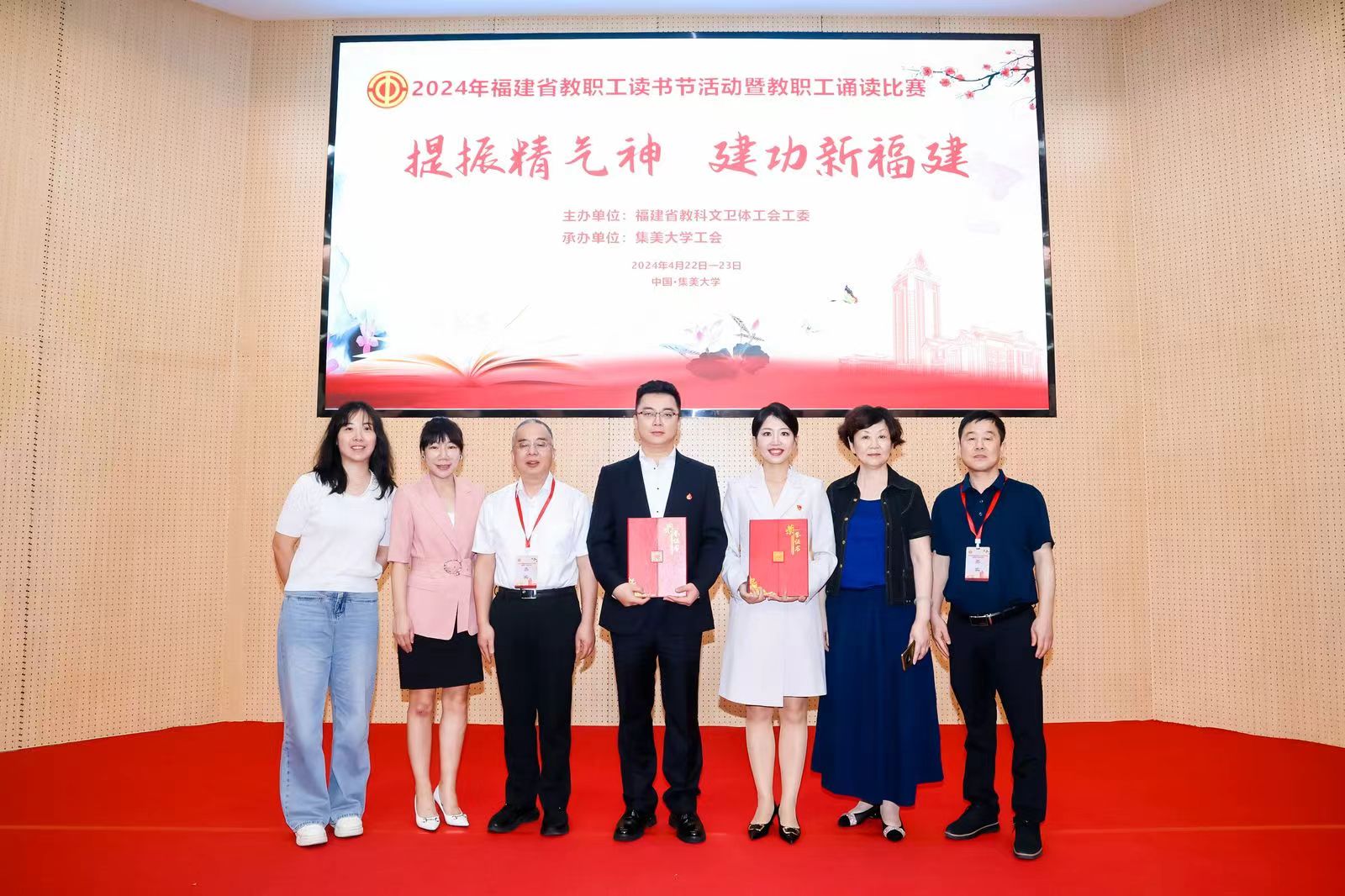 2024年4月23日上午,由福建省教科文卫体工会主办、集美大学工会承办的2024年全省教职工读书节活动暨“提振精气神 建功新福建”教职工诵读比赛在集美大学举行。由我校工会选送,刘茜、陈建泽两位老师演绎的作品《南强红笺》喜获第三名、二等奖。