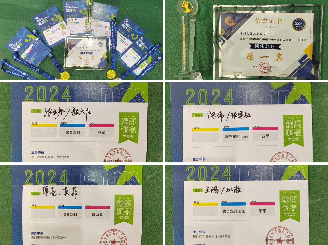 经过历时3天的激烈鏖战,我校代表队荣获“鹭岛先锋”杯厦门市市直机关事业工会网球赛团体总分第一名的好成绩!在混合双打项目中颜六亿/张玉春获得冠军,傅亮/莫菲获得第五名;在男子双打乙组项目中陈伟/张建敏获得亚军,王鹏/孙灏获得季军。
