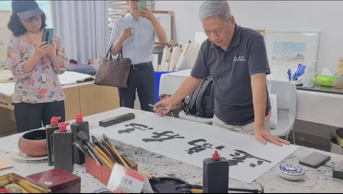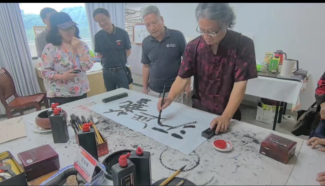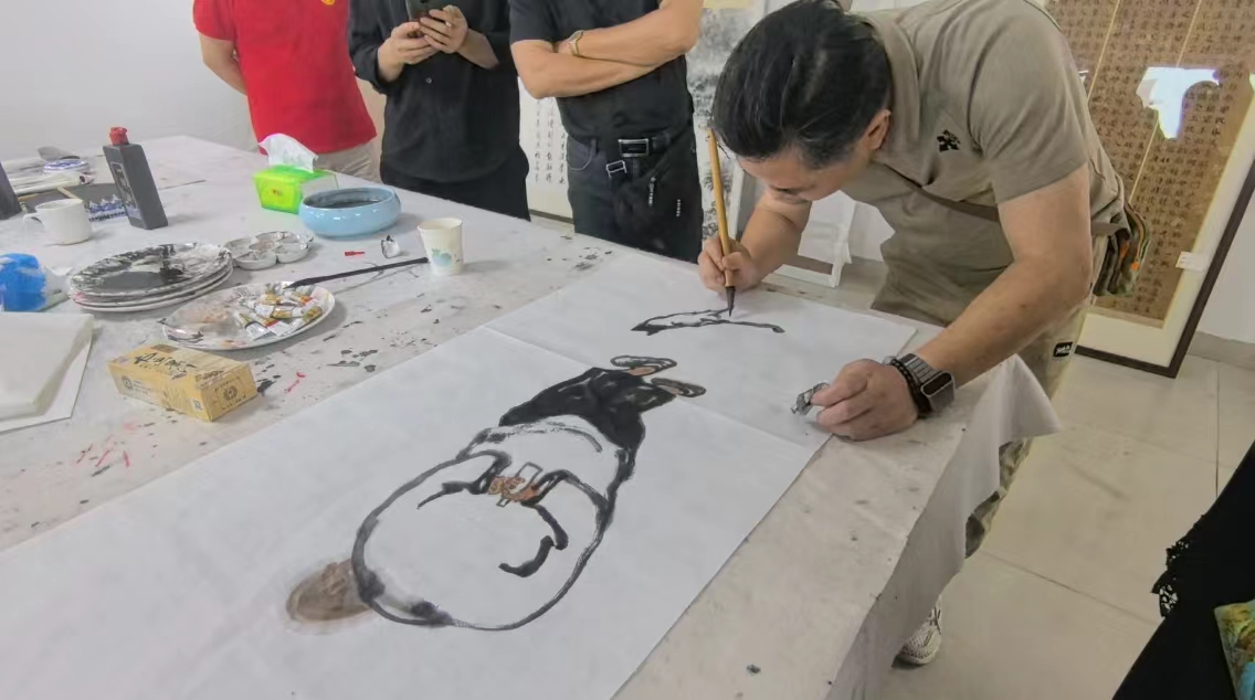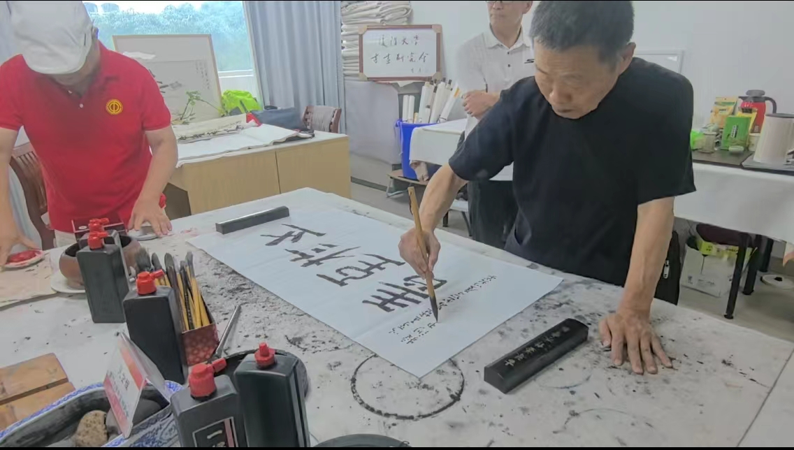 讲座结束后进入了现场交流环节。几方桌椅拼成一张长桌,案头几杆毛笔、几方墨砚,只见现场的书画家们凝神泼墨,笔锋起落间,“艺无涯”“止于至善”“同声相应、同气相求”“醉归图”等一幅幅作品就此诞生,字体苍劲有力、磅礴豪迈,绘画生动有趣,具有极佳的艺术性。