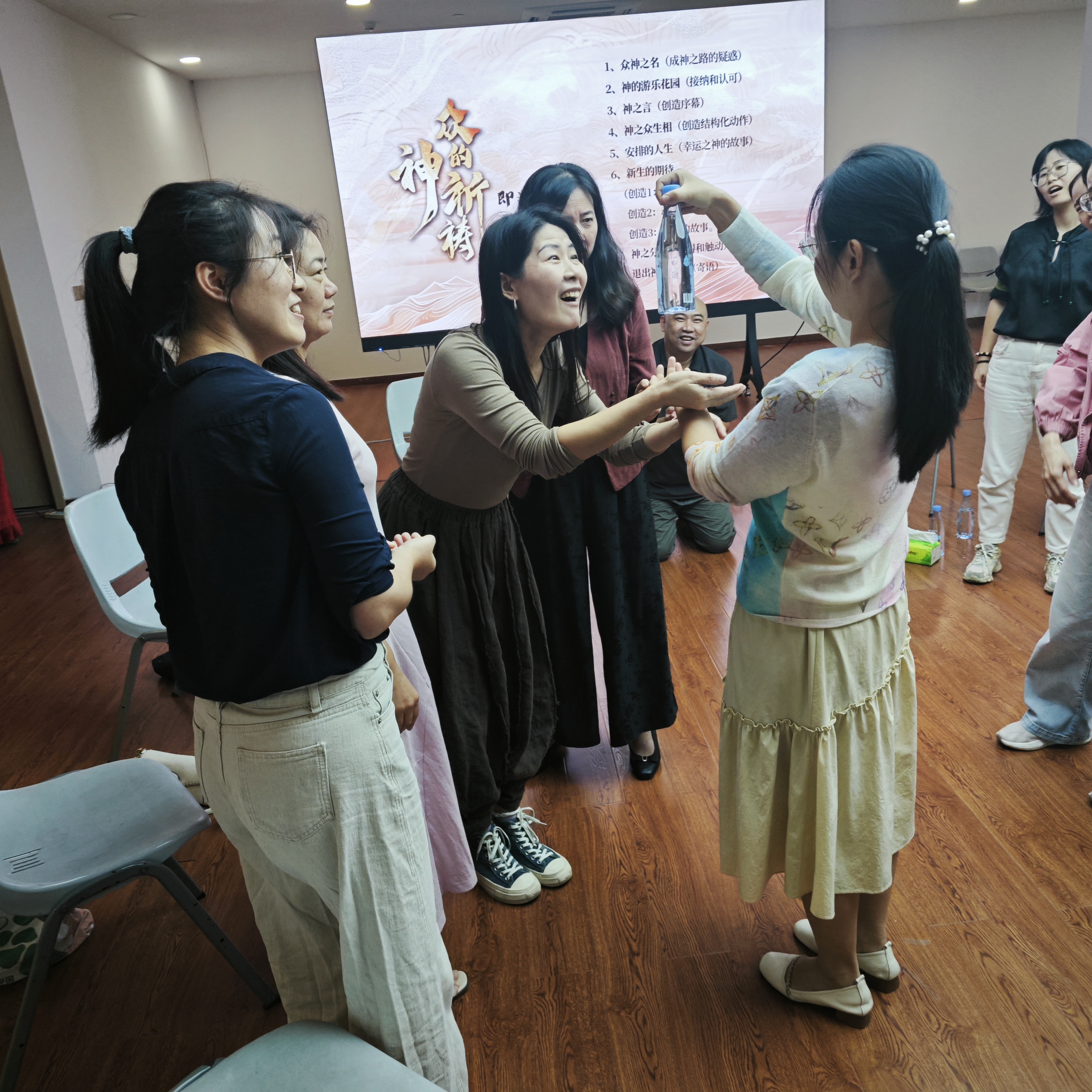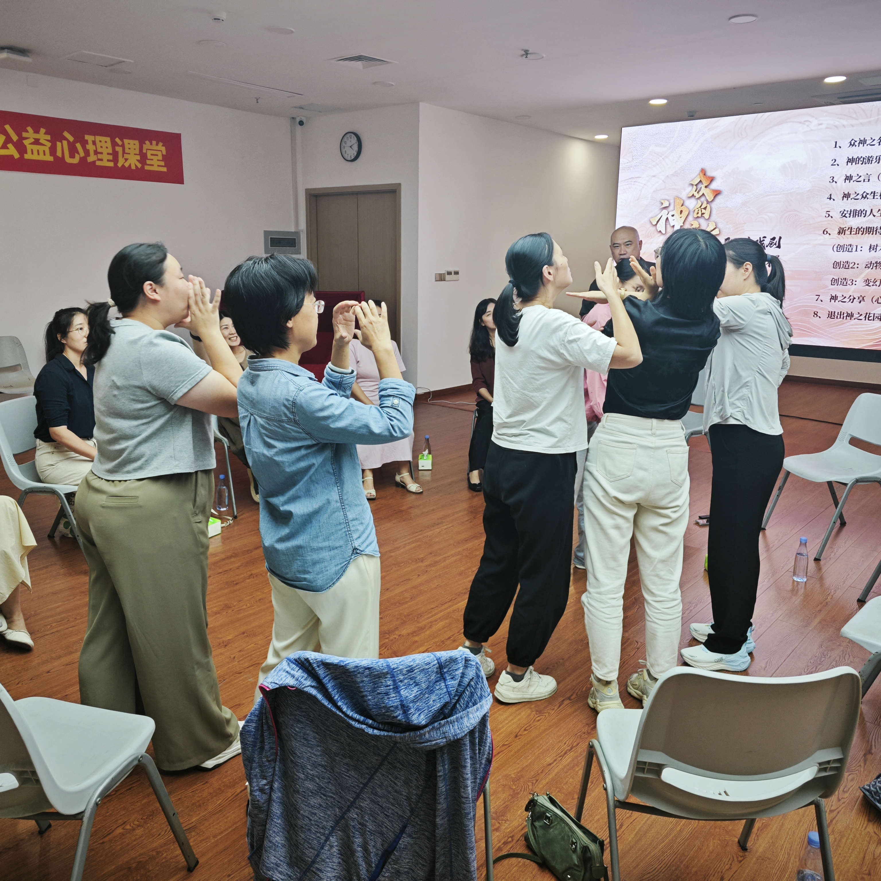 在陈老师的引导下,参与者们投入了一场名为《众神的祈祷》的戏剧游戏。通过扮演“神”的角色使得参与者的人生经验得以延展,陈老师在游戏中适时的点拨使得参与者的心境情绪得以被觉察。