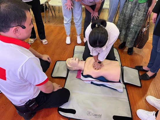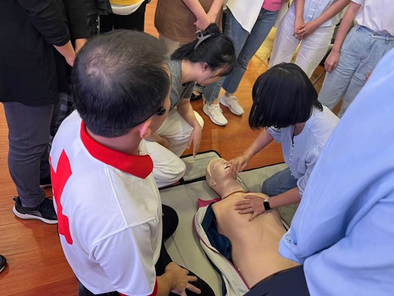 结合发生在现实生活中的急救案例,郭主任讲解了急救基础知识、正确拨打120的步骤、急救的重要性,并着重介绍了心肺复苏和AED(自动体外除颤器)的使用技巧。针对事故发生后的“黄金4分钟”,借助急救人体模型,对如何采取正确且有效的紧急救援措施进行了详细指导。在郭主任的指导下,以互动式教学方法,老师们认真学习救护流程、姿势、力度、频率,并依次在人体模型上进行心肺复苏实操练习。针对老师们实操练习中出现的错误动作,郭主任逐一进行纠正,以帮助他们准确掌握急救操作要领。