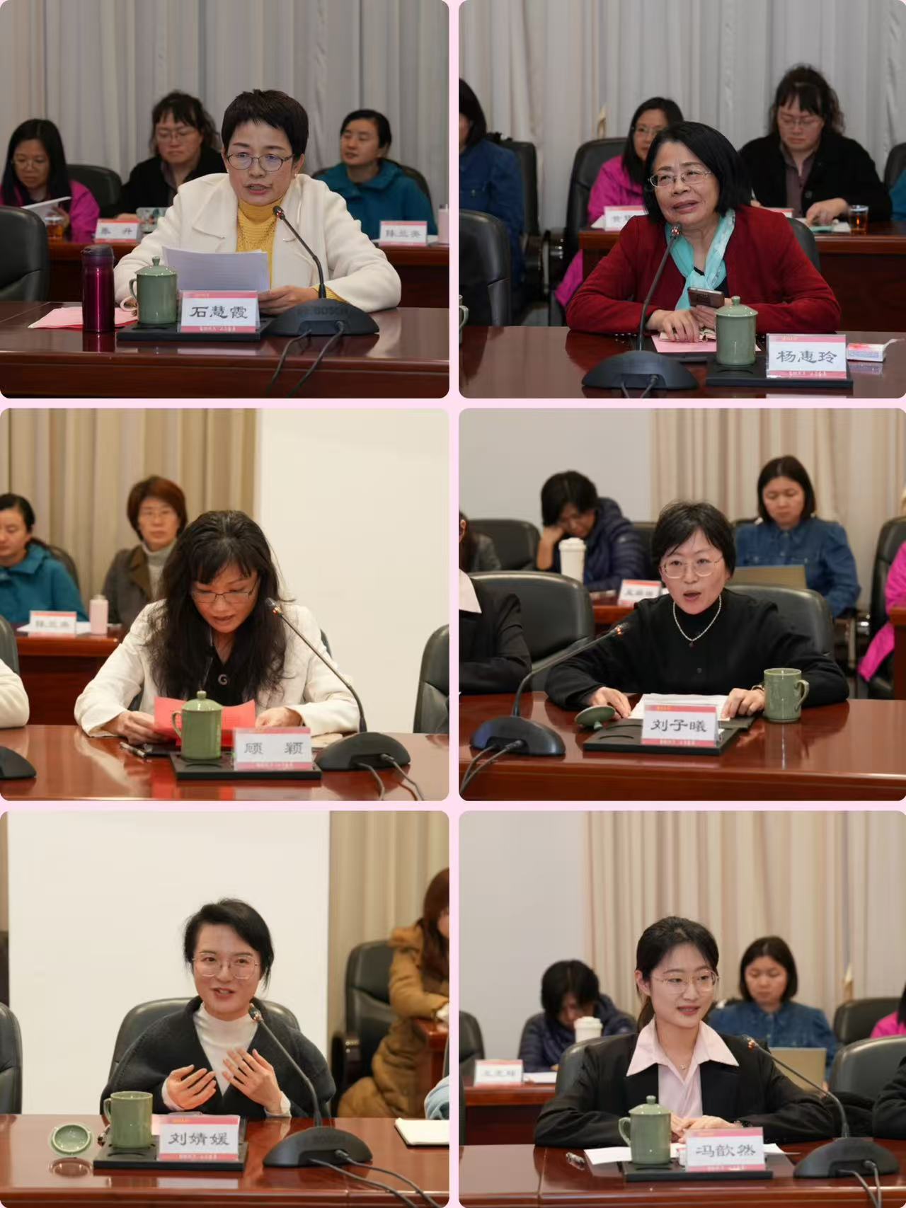 会场内灯光明亮、暖意融融,洋溢着温馨和谐的节日氛围。座谈伊始,校妇委会主任、校工会副主席陈小芬汇报了2024年学校妇女工作有关情况及成果成效。随后,女教职工代表石慧霞、杨惠玲、顾颖、刘子曦、刘婧媛和女学生代表冯歆然,聚焦“凝巾帼智慧 筑强国之梦”主题,立足自身学习工作实际,热情洋溢地讲述了在思想引领、立德树人、科学研究、展现巾帼担当等方面的感悟心声和具体实践,并就如何以巾帼力量助力学校各项事业高质量发展积极建言献策。