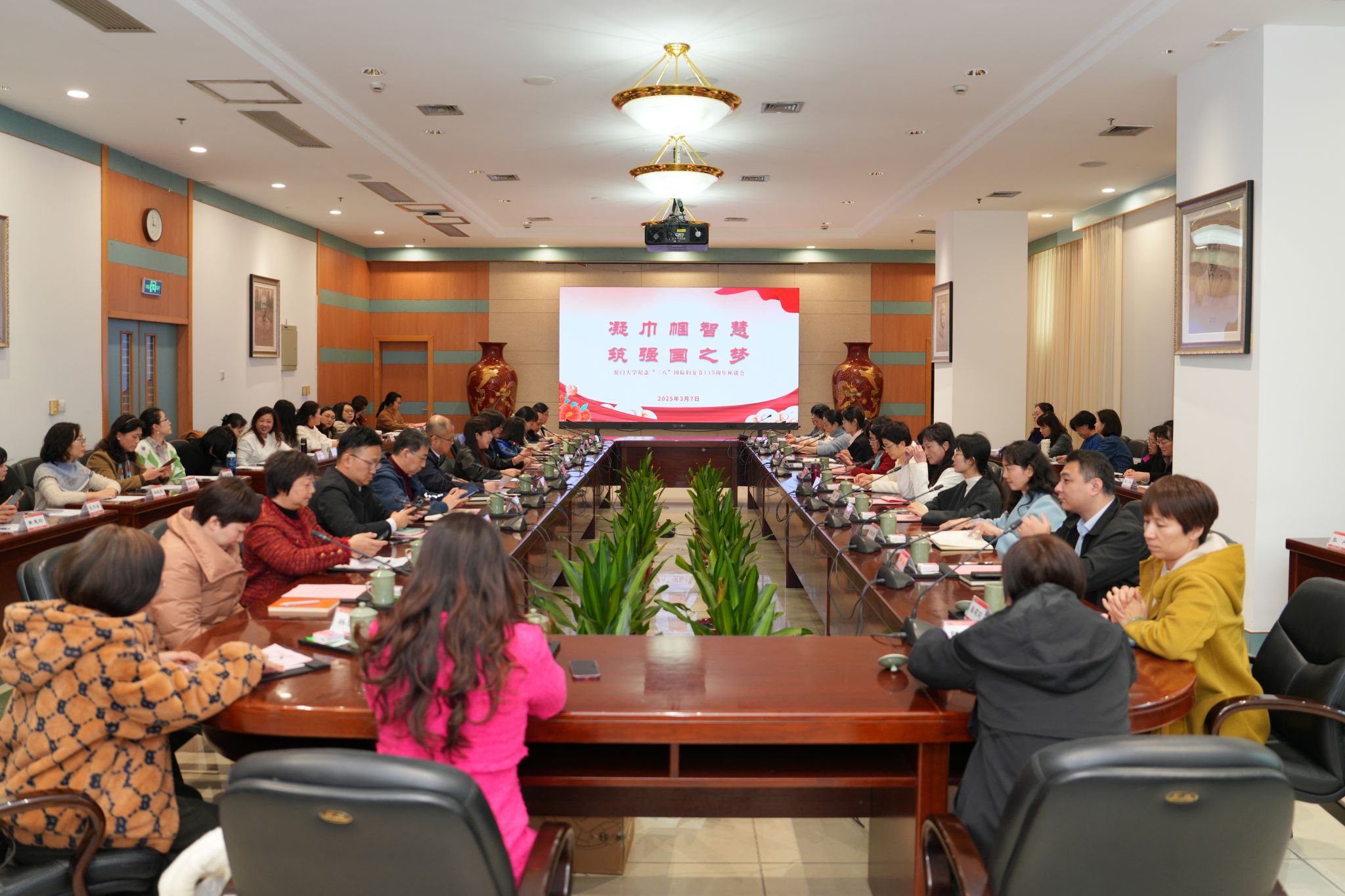 3月7日下午,纪念“三八”国际妇女节115周年座谈会在颂恩楼215会议室举行。校党委常务副书记林东伟,校机关部处、群团组织负责人及基层妇委会主任,来自全校不同领域、不同岗位的女教职工代表、女学生代表等欢聚一堂,共话新时代女性风采,畅谈学校内涵式高质量发展中的巾帼贡献。校工会常务副主席洪秋霞主持座谈会。