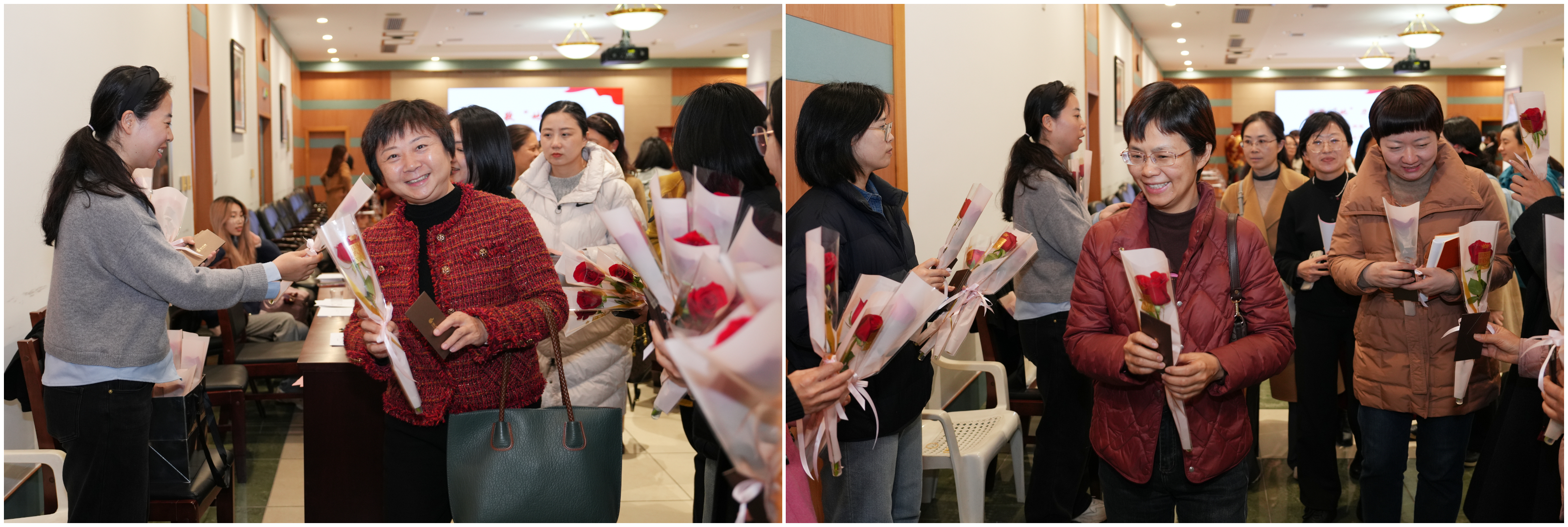 座谈尾声,随着悠扬的旋律响起,校工会和校妇委会为与会人员献上精心准备的玫瑰花束,向她们致以节日祝福与美好祝愿,也为本次座谈会画上了圆满的句号。