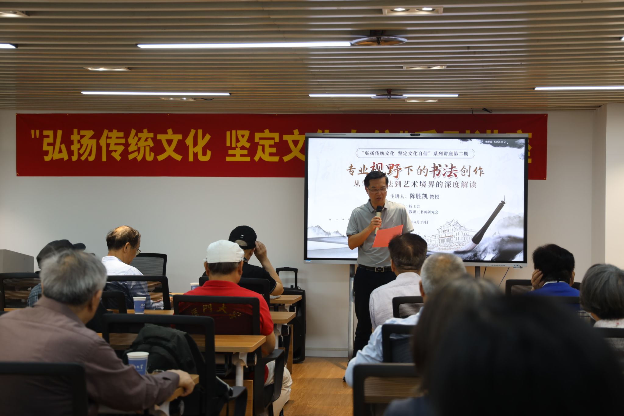 为深入贯彻落实习近平总书记关于文化建设的讲话精神,弘扬中华优秀传统文化,提升教职工艺术素养,2025年4月19日上午,由厦门大学工会主办、厦门大学书画研究会承办的“弘扬传统文化 坚定文化自信”系列讲座之“专业视野下的书法创作”在教职工活动中心三楼306教室成功举办。厦门大学艺术学院陈胜凯教授担任主讲。厦门大学书画研究会会长蒋东明,副会长谢华斌、吴世辉,以及书画研究会会员、教职工和书法爱好者等参加活动,现场墨香氤氲,反响热烈。讲座由厦门大学工会副主席余炳建主持。