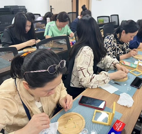 校工会特邀专业匠师现场教学,教职工们化身“手艺人”,在匠师指导下挑选贝片、设计纹样、细心镶嵌。方寸螺钿间,贝壳的天然光泽与漆器的温润质感相映成趣,一条条独一无二的螺钿手链逐渐成型。一位参与活动的教授讲到“螺钿制作看似简单,却需要专注与耐心,正如教书育人,唯有精雕细琢方能成就精品。”