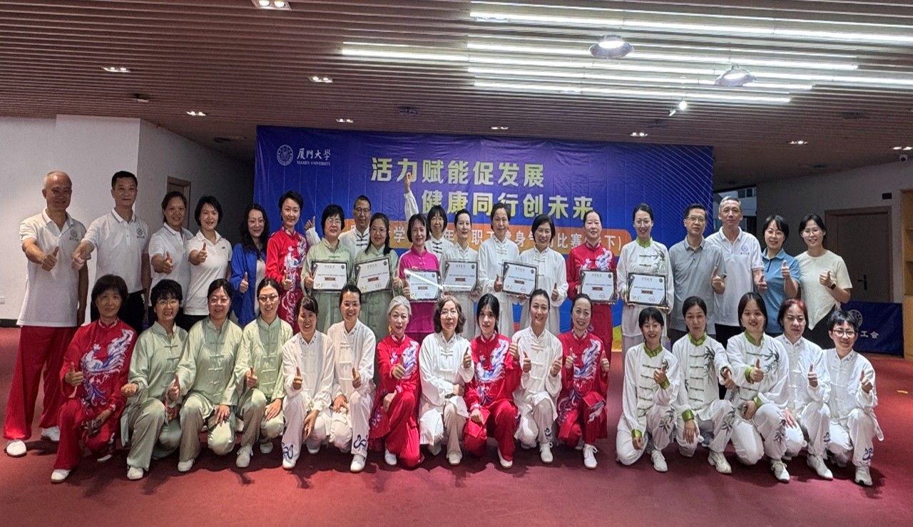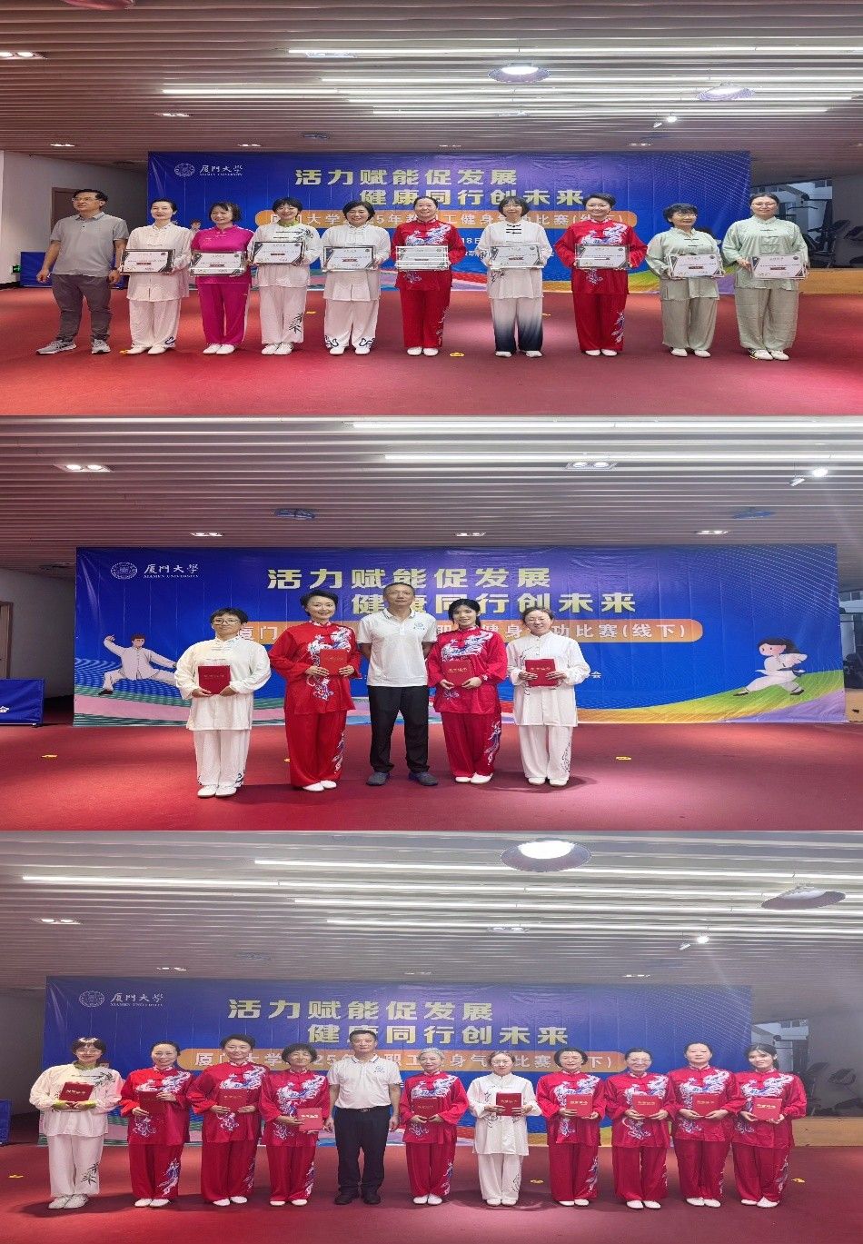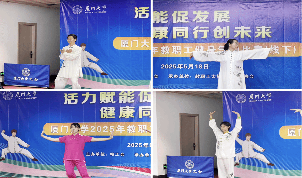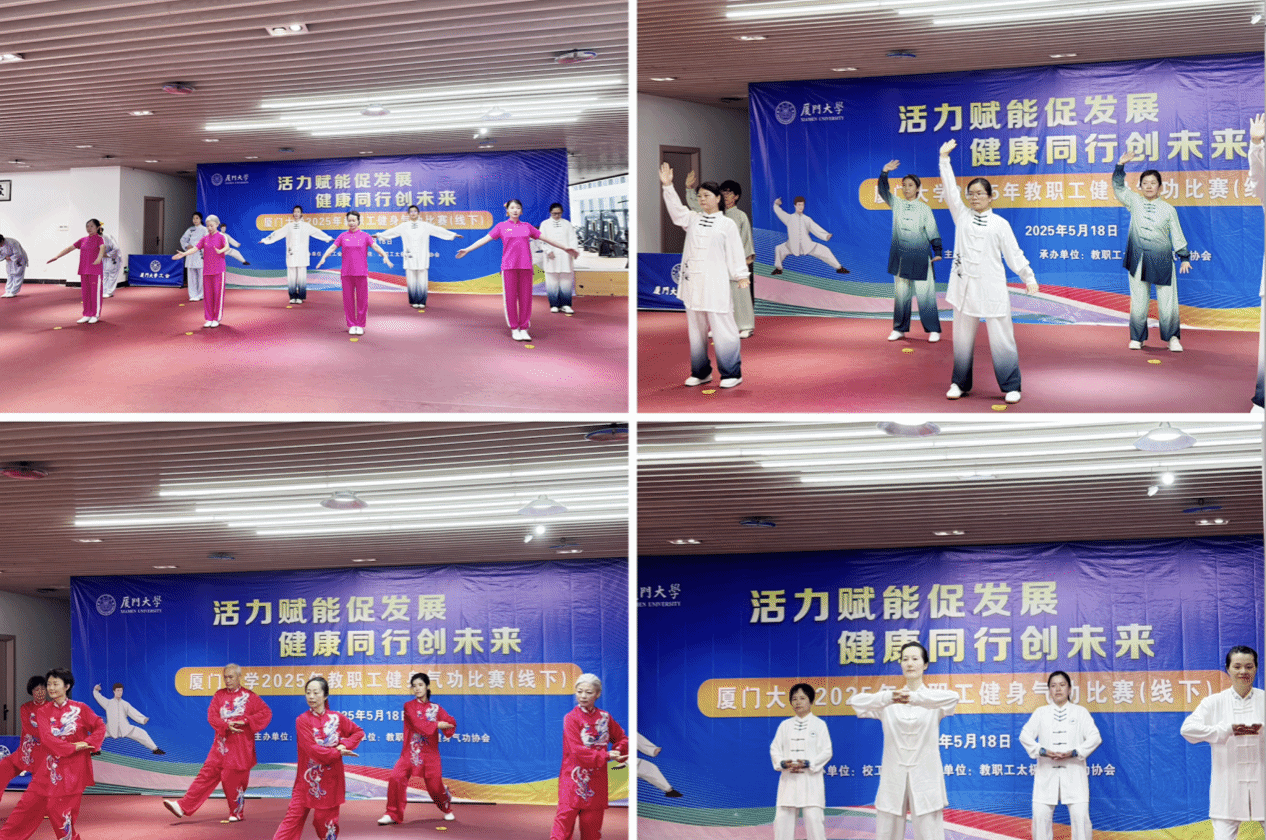 为深入学习贯彻党的二十届三中全会精神,落实《“健康中国2030”规划纲要》,推进全民健身计划实施,进一步增强教职工身体素质,培养教职工顽强拼搏的进取精神,以更饱满的精神状态、更健康的体魄投身教育事业,2025 年 5月 18 日,校工会举办厦门大学 2025 年教职工健身气功(线下)比赛。本次比赛由校教职工太极健身气功协会承办,共设八大项目,涵盖八段锦、导引养生功十二法、太极养生杖等经典功法,吸引了全校近百名教职工踊跃参与。
