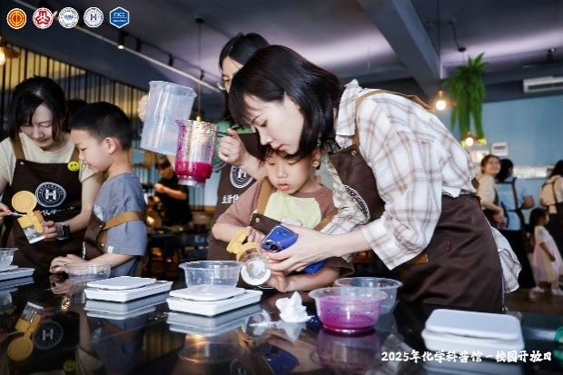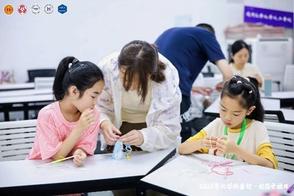 接下来是实践探索环节。在蓝晒印相小组,小朋友们用阳光作画,体验古典摄影工艺中的化学显影奥秘;在分子料理爆爆珠小组,家长和小朋友们一起亲手制作“舌尖上的科学”,感受海藻酸钠凝胶与乳酸钙溶液碰撞出魔法般的离子交舞;在膏泽酯香小组,小朋友们通过称量、加热、混合、乳化,见证从互不相容到完美融合的神奇转变。在结绳探构小组,将传统手工艺与化学分子结构结合,小朋友们通过编织感受科学与文化的双重魅力。