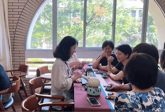在主办方的精心策划与布置下,凤凰花咖啡屋茶香与书香交织——炉上汤沸,水声潺潺;素手布席,茶器温润;墙上悬挂的字画,更添几分古意。师生们将对茶道的热爱与敬意,倾注于每一个动作——从温杯、置茶到注水、奉茶,行云流水,沉静专注。师生们围坐席间,细品香茗,茶汤入口,甘醇流转,仿佛夏日的浮躁与喧嚣皆被涤荡一空,只余下满心的宁静与安然。