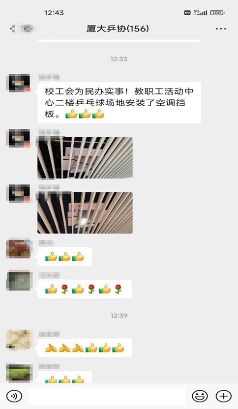 一位老师在微信群里说:“校工会为民办实事!教职工活动中心二楼乒乓球场地安装了空调档板”,其他教职工马上跟进点赞。在现场,老师们说:“校工会优化运动场所照明系统,光线更柔和了,选择更多了,太好了!感谢校工会为教职工办实事!”这样的话还有很多。教职工活动中心运动场所的优化提升工作得到了教职工的一致肯定。