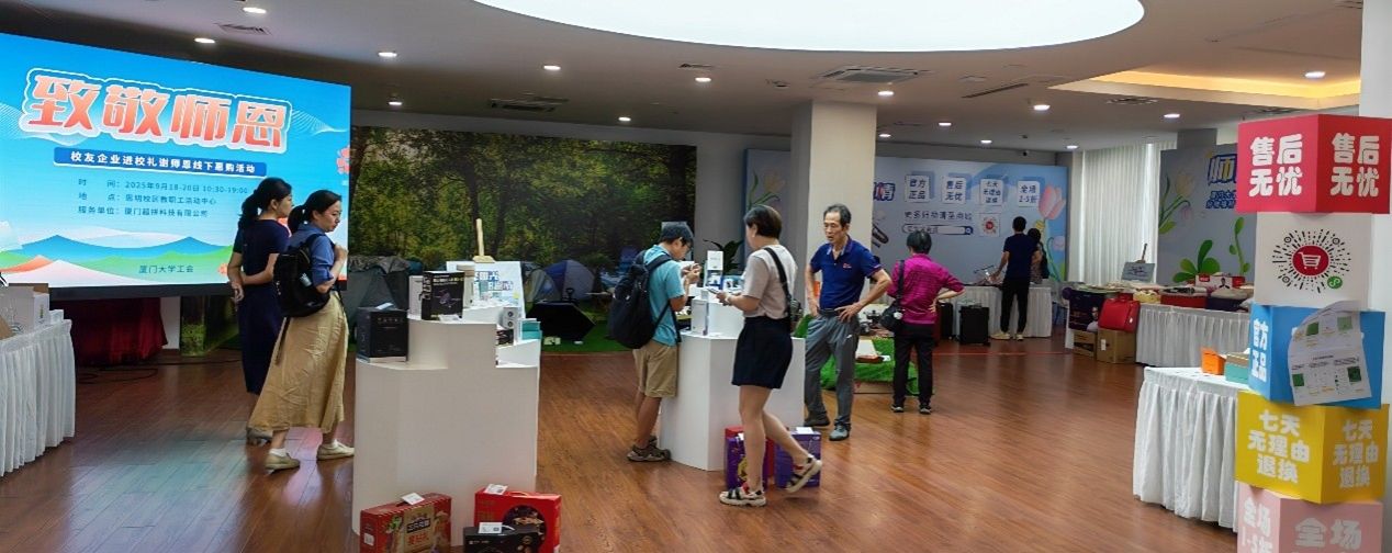 守望初心育桃李,工会关怀润心田。厦门大学工会积极响应国家提振经济、促进消费、惠及民生的政策号召,深入落实全国总工会关于助力职工文化旅游消费的“十项措施”和福建省总工会关于提振职工消费文件精神,联合校友企业厦门超拼科技有限公司,于9月18日至20日,在厦门大学教职工活动中心举办教师节“致敬师恩”惠师系列活动之二——校友企业进校礼谢师恩线下惠购活动,庆祝第41个教师节,向辛勤耕耘在教学科研一线的全校教师传递最真挚的关怀与敬意。