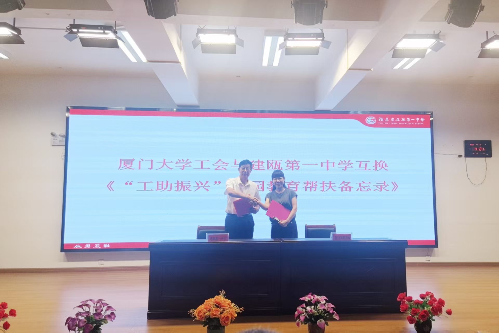 2025年10月15日下午,在福建省建瓯第一中学会议室,厦门大学工会与福建省建瓯第一中学交换了《“工助振兴”校园教育帮扶备忘录》,明确双方将围绕科普教育、拔尖学生培养、学科奥赛辅导及中外合作办学指导等领域开展深度合作。厦门大学工会将依托本校外文学院、数学科学学院、物理科学与技术学院、化学化工学院、信息学院、航空航天学院、生命科学学院等基层工会的组织力量,充分发挥各学院的学科优势,选派专家教师或优秀研究生赴建瓯一中开展专题讲座、以寒暑假社会实践的形式在建瓯一中开展科学项目指导及竞赛培训,协助建瓯一中中澳班优化外语教学体系,打造跨文化校园品牌活动。本次“工扶振兴”专项行动将助力建瓯一中优化师资队伍结构、提升教师专业能力,拓宽学生学术视野、培养学生创新思维与科学素养,推动建瓯一中教育教学水平与人才培养质量整体提升。