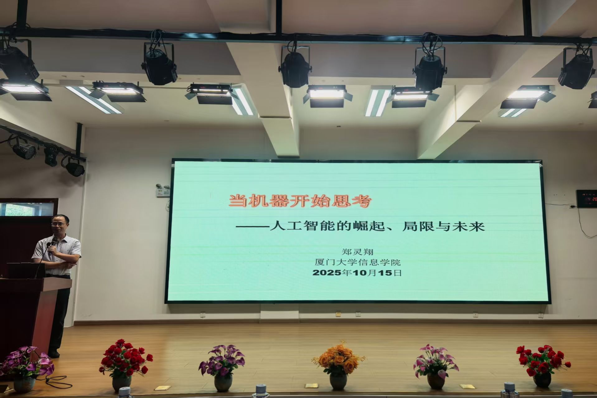 随后,在《人工智能的崛起、局限与未来》专题讲座中,厦门大学信息学院郑灵翔教授生动讲解了AI技术原理、应用场景及未来发展趋势,同时,他也指出了AI功能的局限并对在AI时代我们应该如何自处给出了合理的建议,他鼓励学生积极探索科技前沿的同时保持批判精神,不盲信AI,以合作的关系使用AI而非完全的依赖。在使用AI的过程中做到会提问,会思考,能判断,让AI真正成为我们学习生活的伙伴。讲座现场气氛热烈,激发了学生对智能科学的浓厚兴趣。