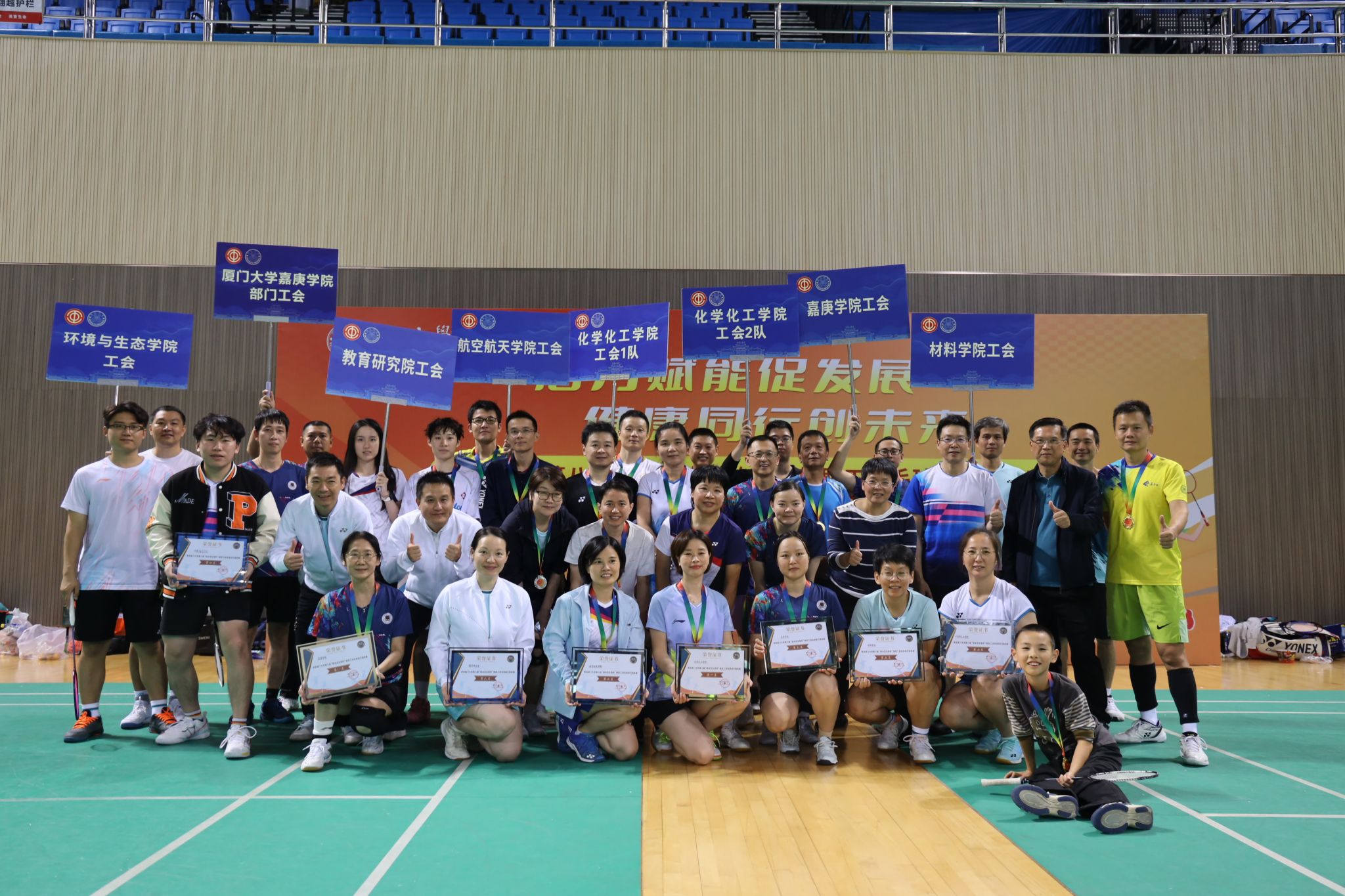 研究生院副院长兼培养与管理办公室主任郭建鹏,材料学院院长、校教职工羽毛球协会会长解荣军,校工会副主席余炳建为获得前八名队伍颁奖。