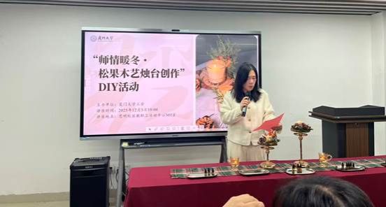 为丰富教职工精神文化生活,营造温馨和谐的校园氛围,2025年12月5日晚七点,厦门大学工会在思明校区教职工活动中心303室举办了“师情暖冬·松果木艺烛台创作”DIY主题活动。活动由校工会副主席郭如梅主持。