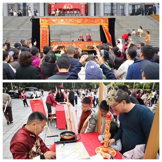 今年的非遗展示环节在往年基础上新增糖画体验项目,成为活动的一大亮点。非遗传承人现场展示糖画制作技艺,以糖为墨、以勺为笔,顷刻间一幅幅栩栩如生的骏马、福字等图案跃然板上,既饱含传统韵味,又充满趣味互动,吸引众多师生驻足欣赏和体验。非遗布袋木偶戏继续亮眼登台献艺,唱念做打间尽显中华传统文化魅力,为游园会增添了浓厚的文化气息。