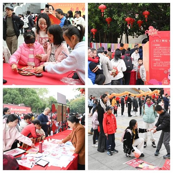 游园会现场还设有多个互动区域,内容丰富多彩,气氛热烈融洽。在“新春送福”区,校书画研究会的老师们挥毫泼墨,书写春联和福字,绘制寓意吉祥、栩栩如生的传统年画,传递美好的新春祝愿;在传统文化体验区,离退休老师们手把手教授中国结编织与窗花剪纸,丝丝缕缕间寄托着对新春的期盼;灯谜竞猜区域人头攒动,大家或凝神思考,或