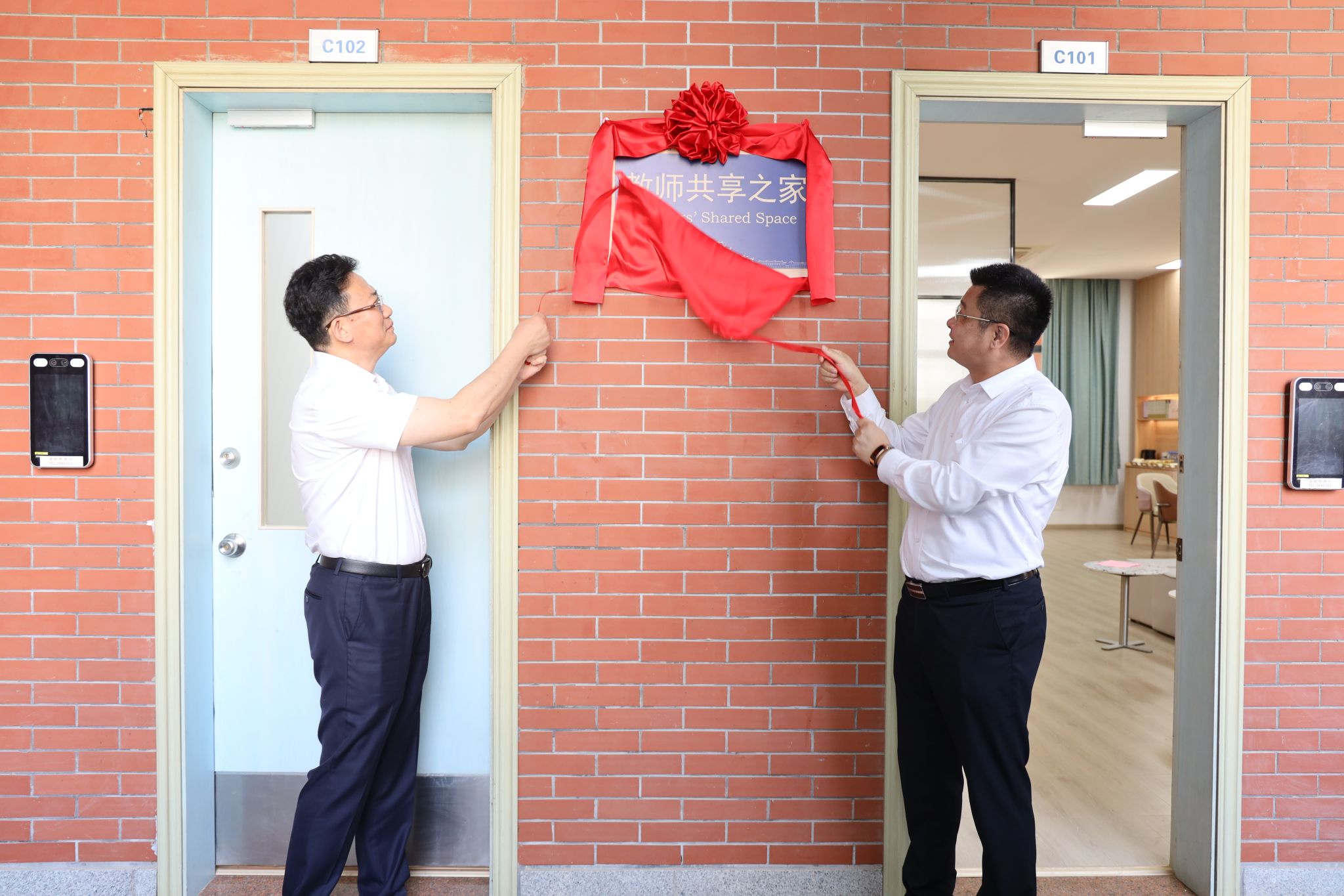 在热烈的掌声中,孙理和陈怀锋共同为“共享之家”揭牌,厦门大学翔安校区教职工“共享之家”正式启用。