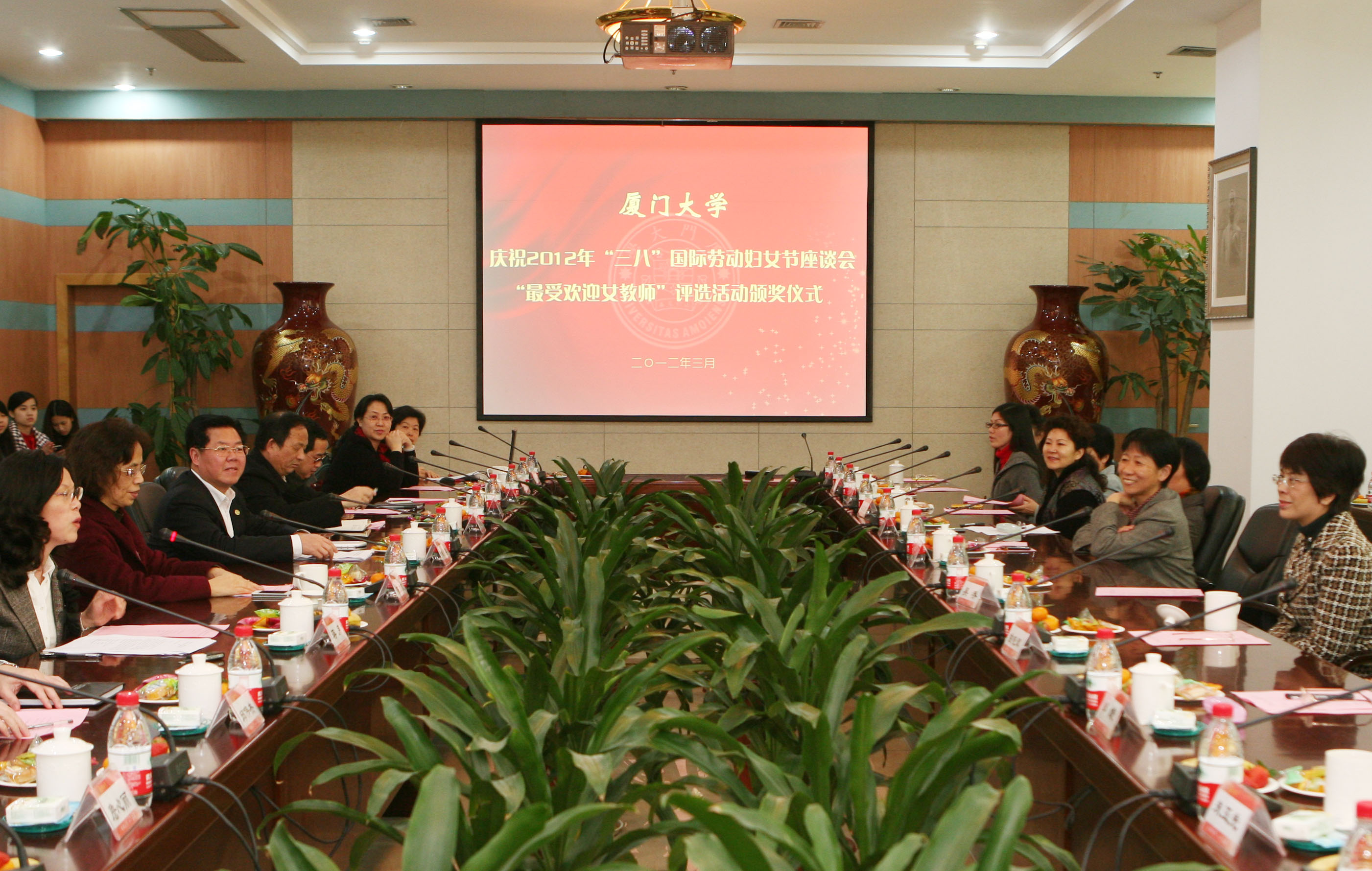 3月7日下午,我校妇女代表在颂恩楼215会议室欢聚一堂,庆祝2012年“三八”国际劳动妇女节座谈会暨“最受欢迎女教师”评选活动颁奖仪式在这里举行。校长朱崇实出席座谈会,代表校党委、行政向我校广大女同胞致以节日的祝贺和亲切的慰问。校党委副书记陈力文出席。校工会副主席、妇委会主任蒋月主持座谈会。