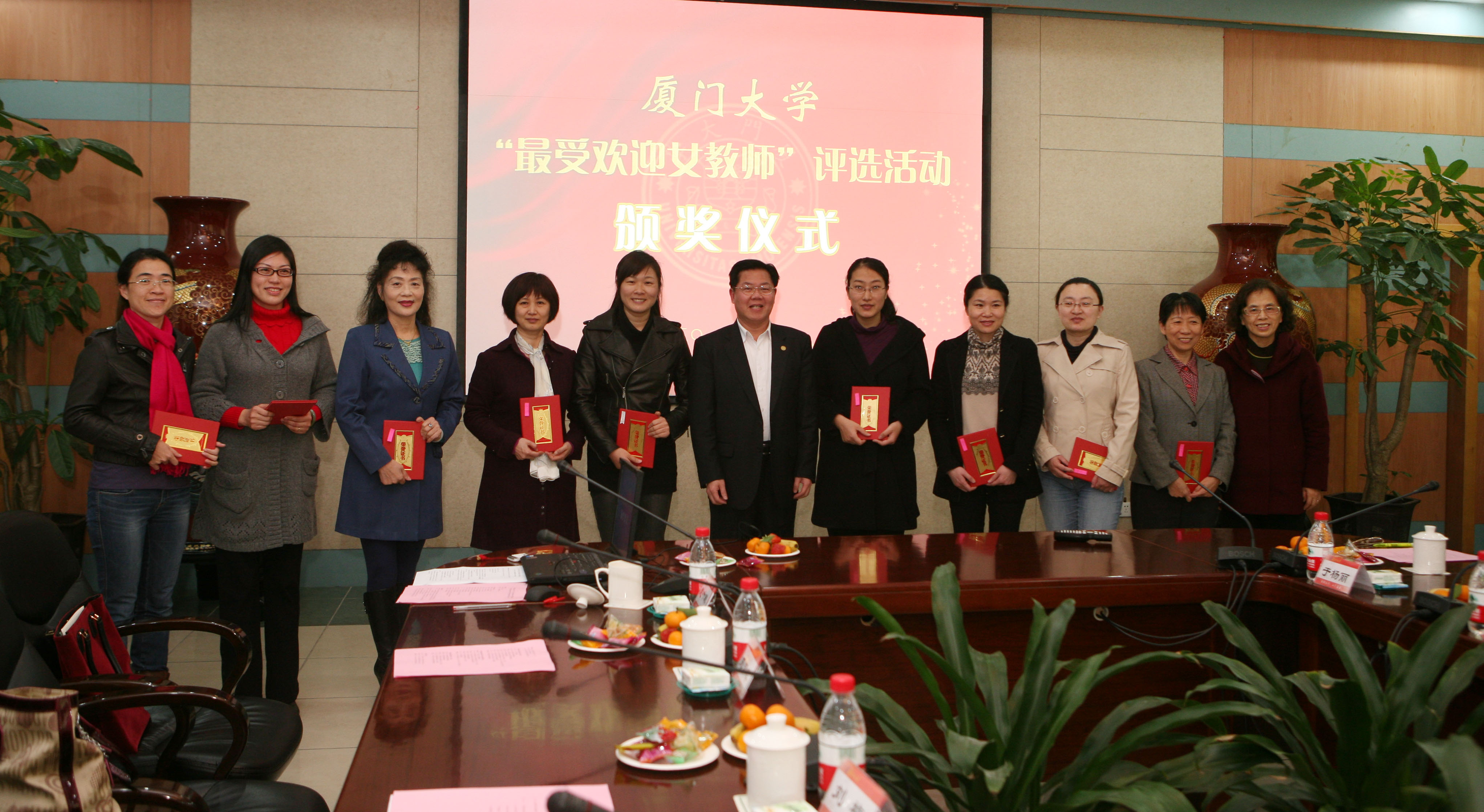会议首先为首届“最受欢迎女教师”评选活动的22位获奖女教师颁奖。活动自去年3月启动,通过全校范围内的推荐提名、网络投票和评审委员会审议,从2007年9月以来任教我校的女教师中,评选出10名“最受欢迎女教师”,其中专业课教师8名,公共课教师2名,另外评选出提名奖和入围奖12名。其中,10名“最受欢迎女教师”是公共课教师、人文学院李莉和物理与机电工程学院于杨丽,专业课教师、化学化工学院朱亚先、信息科学与技术学院鞠颖、人文学院李菁、数学科学学院林鹭、材料学院余兆菊、海洋与地球学院袁东星、软件学院王美红和新闻传播学院佘绍敏。朱崇实、陈力文等为她们颁奖。