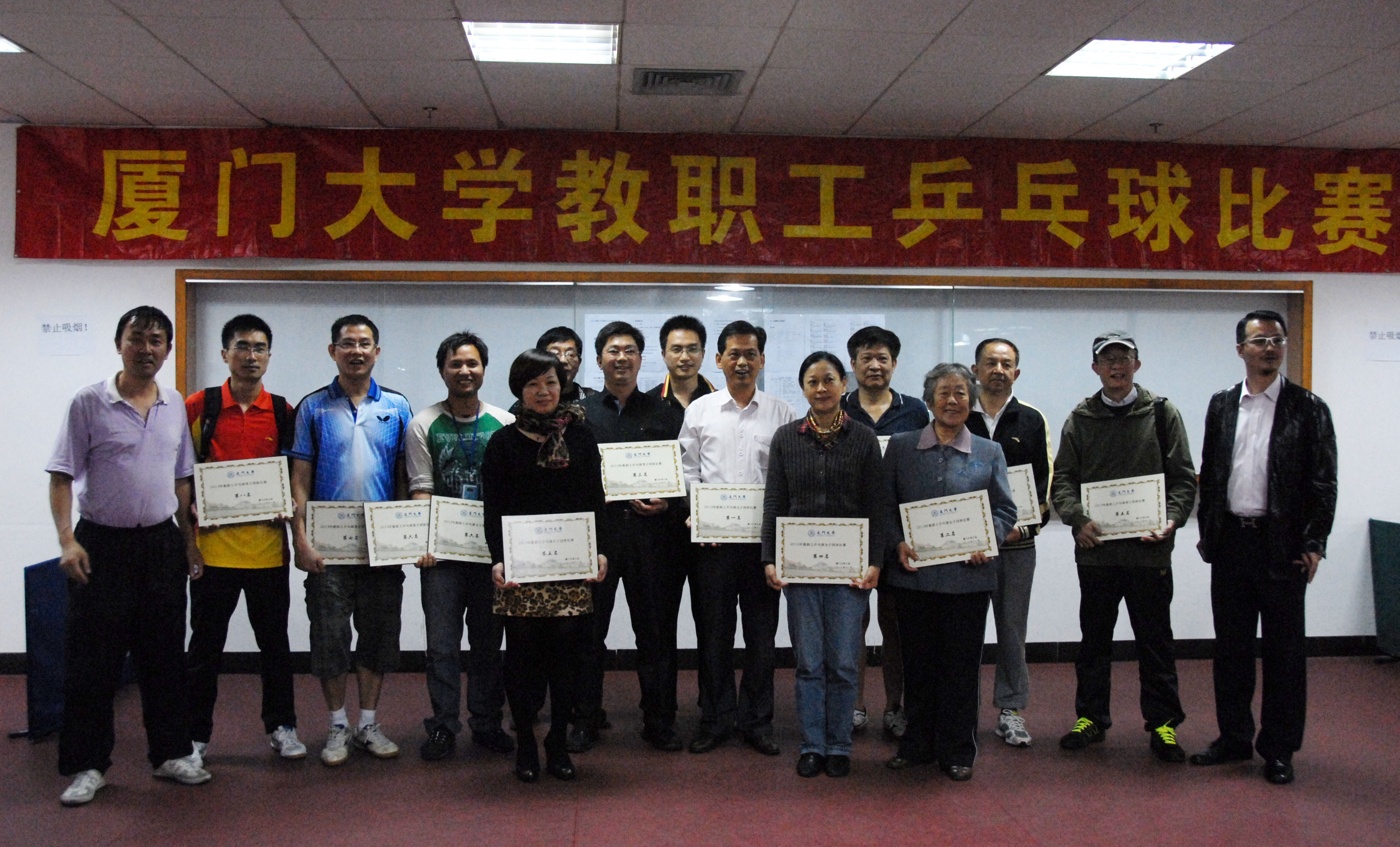 从11月25日起至11月28日结束,经过小组循环赛、淘汰和附加赛两个阶段的激烈竞争,由去年冠军队----机关一总支为班底组成的机关部门工会1队以7战全胜的战绩荣登男子冠军宝座,新组建的机关部门工会女队也以全胜的战绩荣获冠军。值得一提的是荣获男子亚军的海洋与地球学院代表队,他们力图改变“千年老二”的局面,在决赛中大胆变阵,把第一主力排到第三单打的位置,准备出奇制胜,无奈在实力更胜一筹的机关队面前他们未能如愿,依然以0:3大比分失利。荣获男子组3至8名的代表队分别是:机关部门工会2队、建筑与土木工程学院、图书信息档案部门工会、医学院、管理学院1队、厦门大学附属第一医院;荣获女子组2至6名的代表队分别是:老体协、化学化工学院、建筑与土木工程学院、国际学术交流中心、医学院。