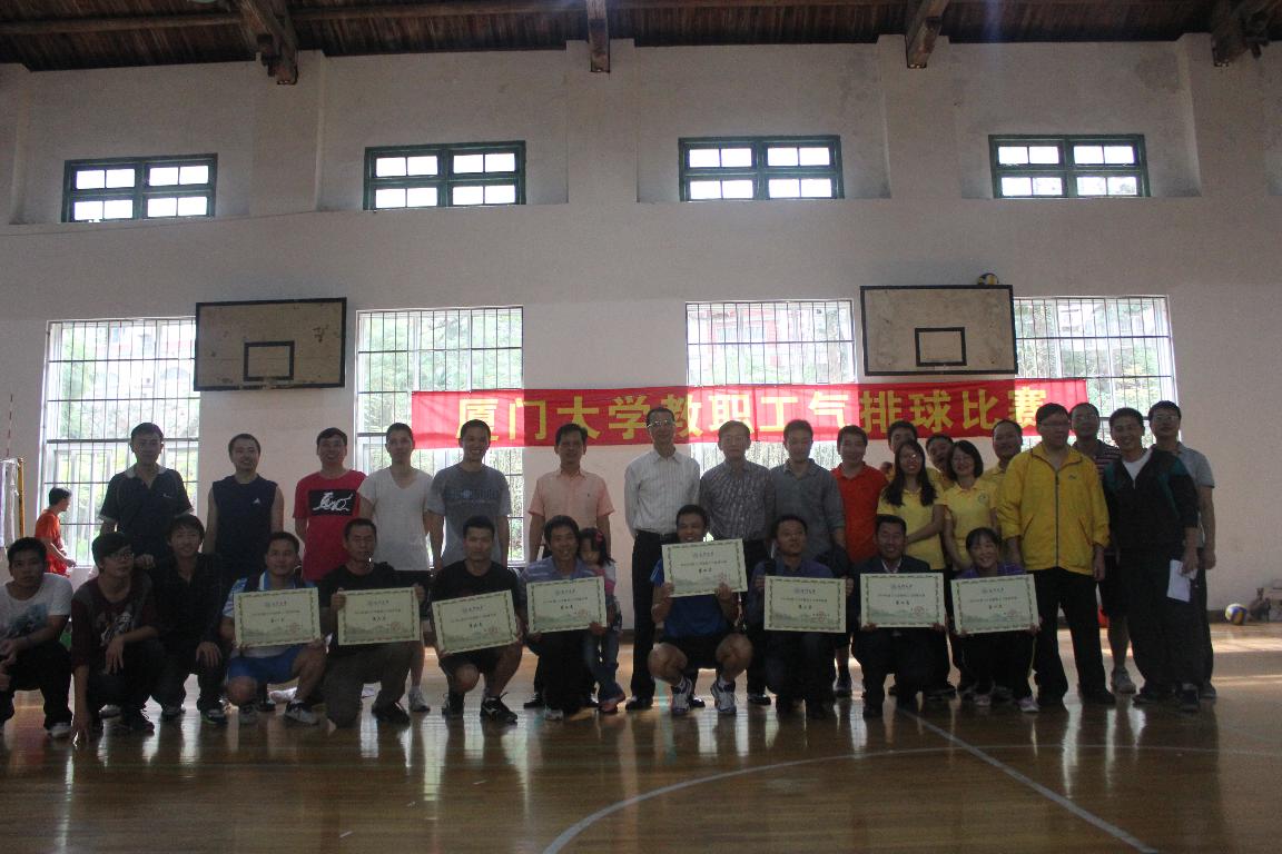 第二届厦门大学教职工气排球比赛于11月22日在校本部风雨球场拉开帷幕,经过两天30多场的激烈争夺,11月23日圆满结束。物理与机电工程学院代表队在决赛中战胜医学院代表队蝉联冠军,医学院代表队屈居亚军,化学化工学院、数学科学学院、海洋与地球学院、图书信息档案部门工会、公共事务学院、机关部门工会代表队分获三至八名。校党委副书记、校工会主席赖虹凯,校工会常务副主席宋毅,校工会副主席史虞龙等领导观看了比赛并为优胜代表队颁奖。