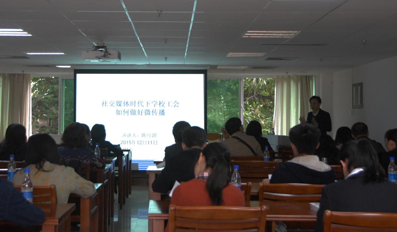 12月11日,校工会组织工会宣传信息员培训班。邀请新闻传播学院陈经超副教授做《社交媒体下学校工会如何做好微传播》讲座,校工会干部40多人参加培训,培训由校工会副主席秦红梅主持。