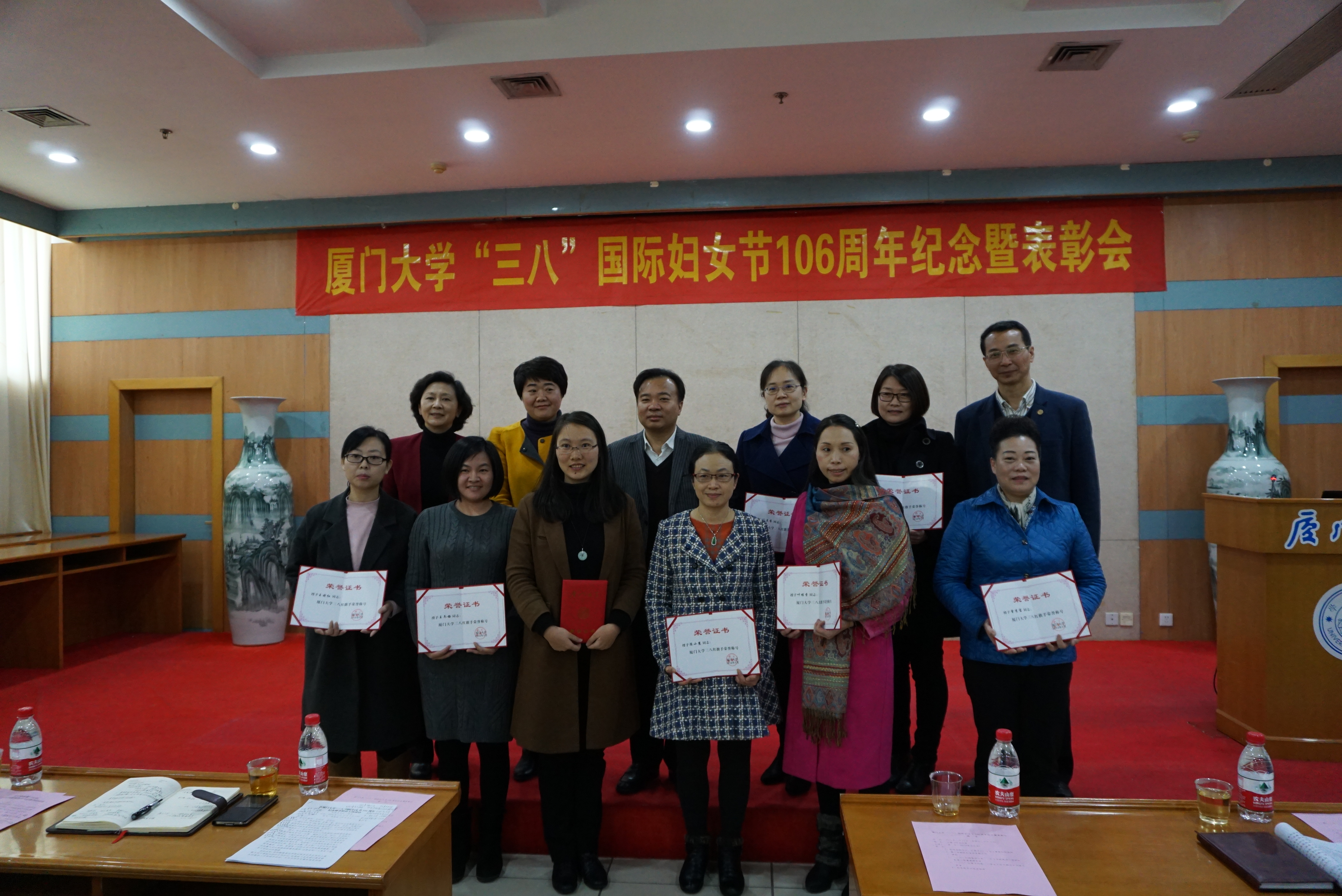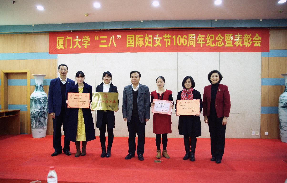 3月11日,厦门大学纪念“三八”国际妇女节106周年座谈暨表彰会在颂恩楼220会议室举行。校党委书记张彦,校党委副书记、纪委书记、校工会主席赖虹凯,副校长詹心丽出席表彰会,并为获得厦门大学三八红旗手光荣称号的集体和个人颁奖。表彰会由校工会副主席、校妇委会主任蒋月主持。