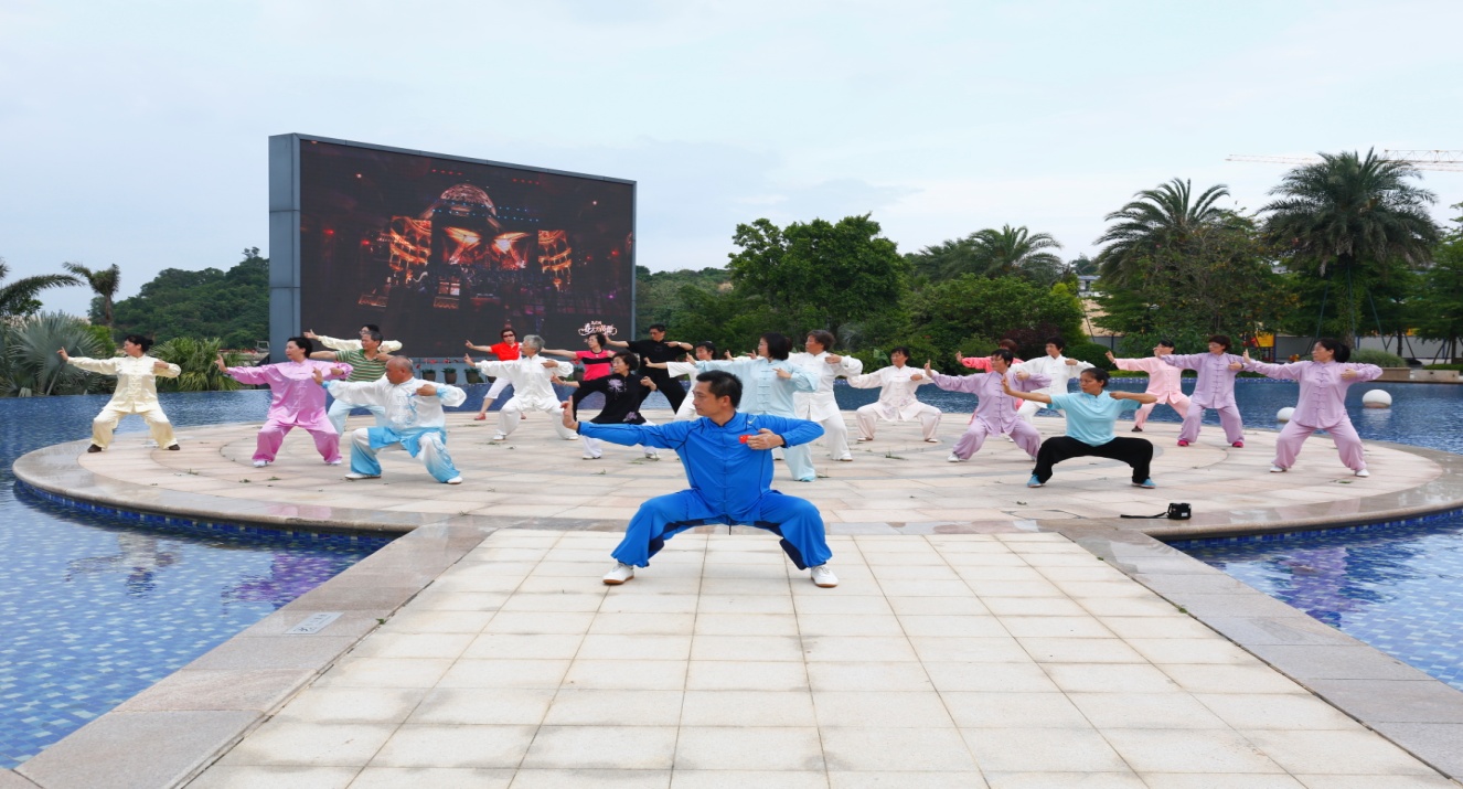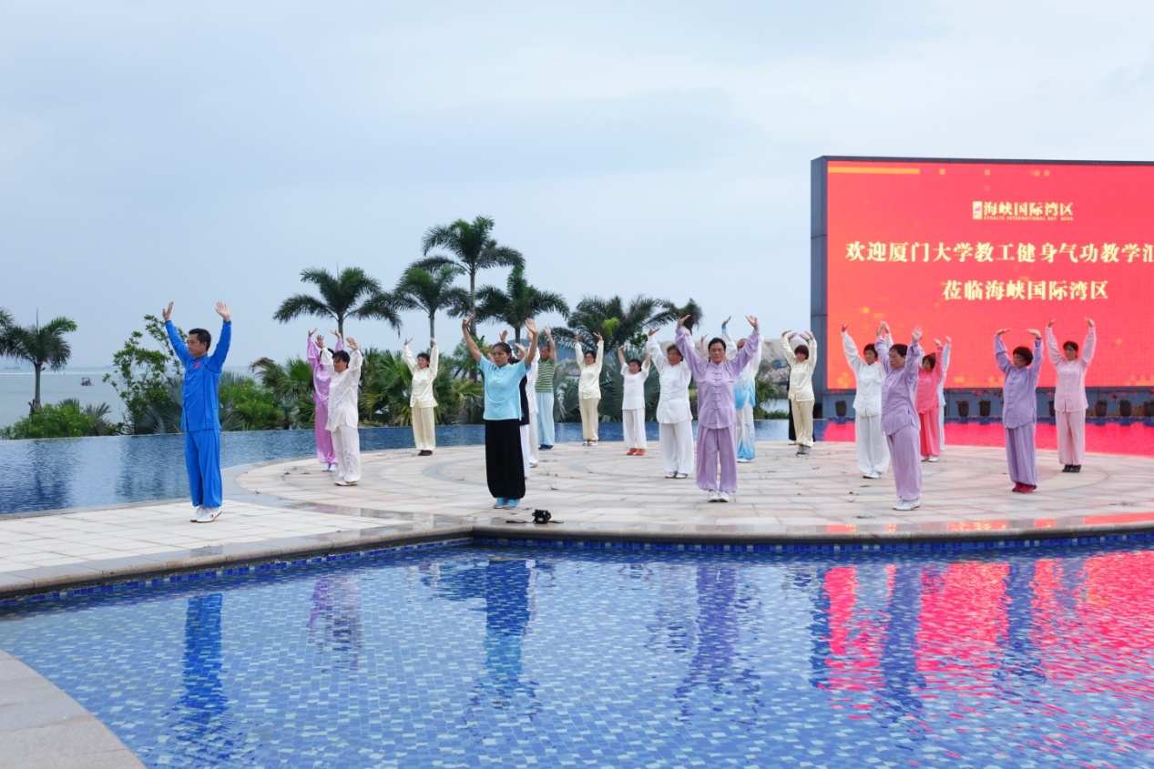 5月29日,厦门大学工会组织教工健身气功培训班进行期末教学汇报总结。活动在漳州校区南太武山脚下的海峡国际湾区举行,共有来自全校参加健身气功培训班的40名骨干教职工参加。活动在海峡国际湾区的水上咖啡吧广场进行了健身气功六字诀、八段锦、太极拳、易筋经、五禽戏和导引养生功十二法的集体演练,并由部分教工骨干进行了本学期新授内容健身气功马王堆导引术的展示表演。