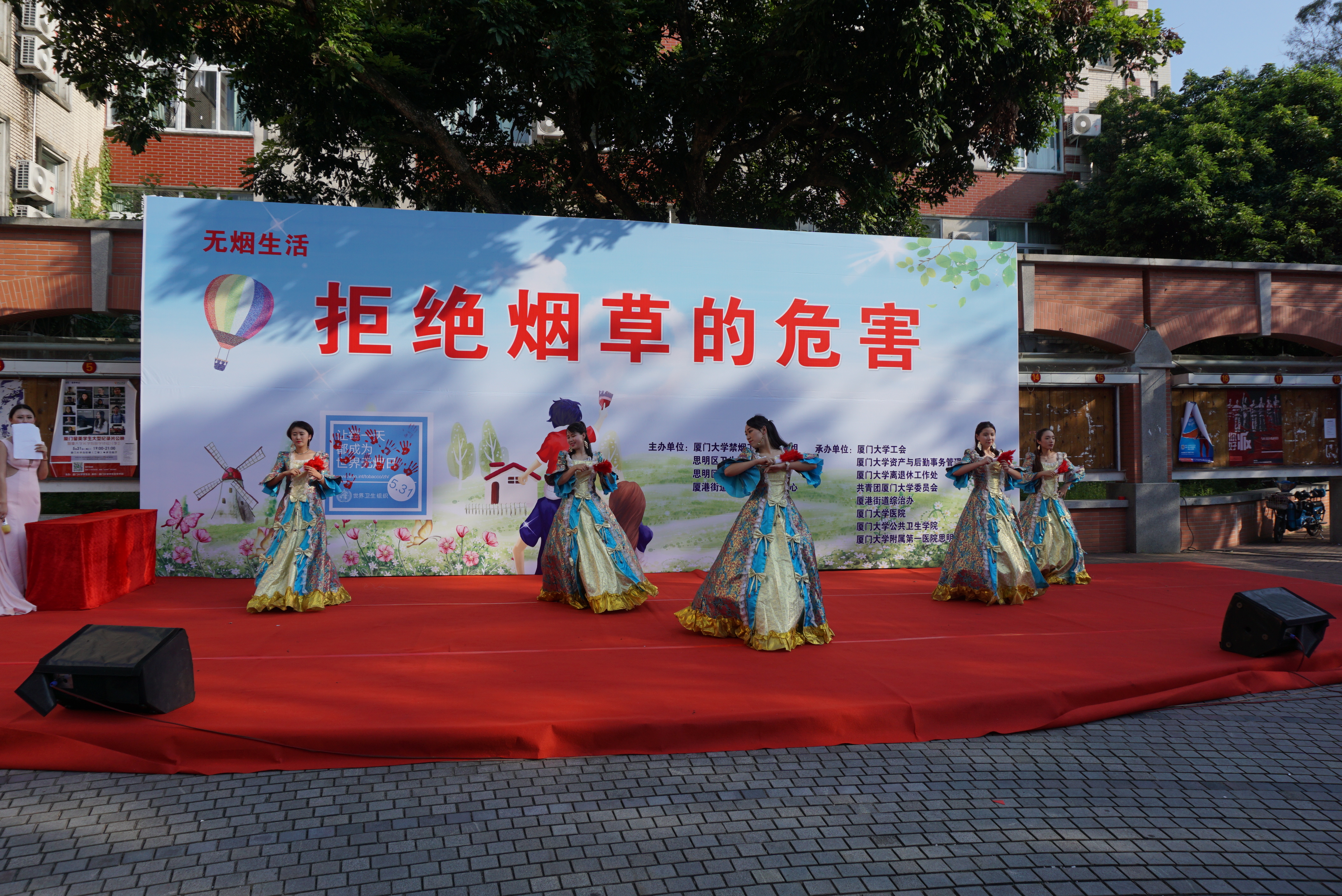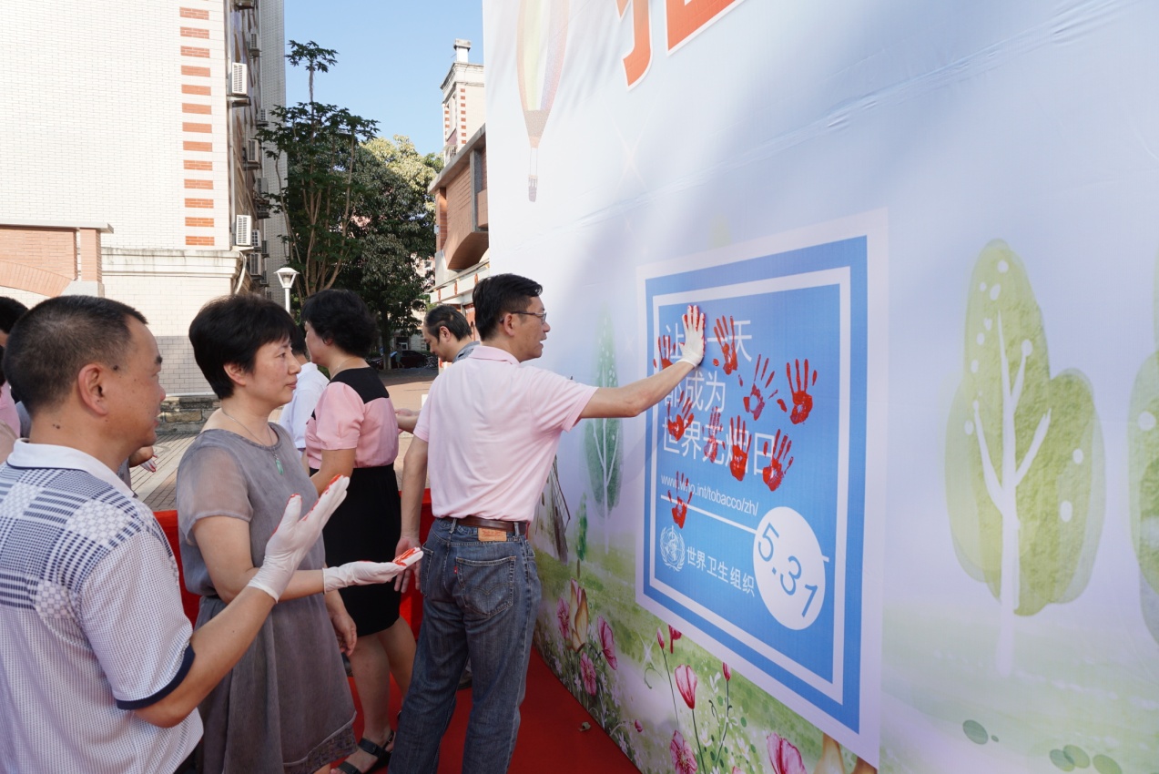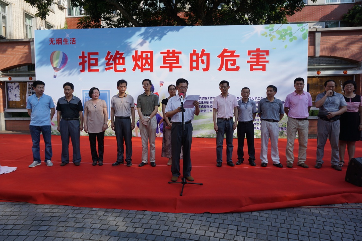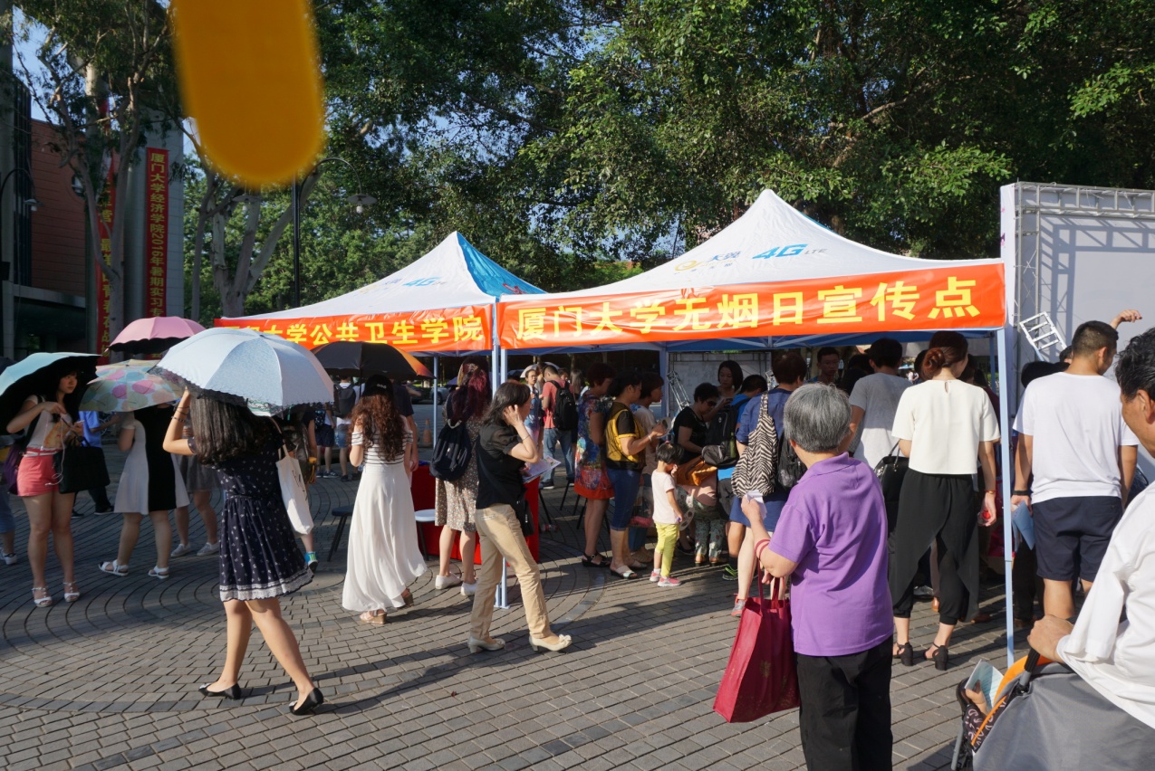 5月31日下午,由厦门大学禁烟工作领导小组、思明区卫生和计划生育局,思明区疾病预防与控制中心、厦港街道社区卫生服务中心主办,厦门大学工会、厦门大学资产与后勤事务管理处、厦门大学离退休工作处、共青团厦门大学委员会、厦港街道综治办、厦门大学附属中山医院演武分院、厦门大学公共卫生学院、和厦门大学附属第一医院思明分院承办的世界第29个无烟日宣传活动在我校三家村学生活动广场举办。我校校长助理滕伯刚教授、思明区卫生和计划生育局陈齐云副局长、思明区疾病预防控制中心林劲副主任、思明区厦港街道卫生服务中心薛梅副主任、我校工会常务副主席宋毅、离退休工作处郑建华处长、共青团厦门大学委员会陈怀锋书记、附属中山医院演武分院院长吴岳平教授、公共卫生学院张琥书记,以及我校工会史虞龙副主席、秦红梅副主席、离退休处周一钦副处长、校团委副书记廖晓波和公共卫生学院黄兆君副书记等领导出席并启动宣传活动。