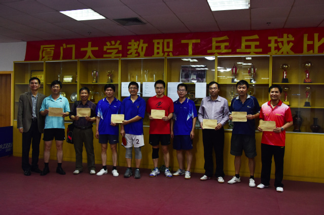 4月7日晚上,由校工会主办的庆祝厦门大学建校96周年第四届“校庆杯”教职工乒乓球双打比赛在教职工活动中心乒乓球场圆满落幕。本次比赛共有来自全校的近40名教职工参与比赛,经过小组循环赛和决赛两个阶段的激烈角逐,机关党委的林强/石济宇荣获冠军、化学化工学院的谭凯/杜荣归、老体协的余辛/黄耀坚、医学院的钱林超/王泽恩、机关党委的陈怀锋/谢火木、药学院的朱铉/林煜杰、机关党委的宋毅/柯志坚、第一医院的陈新佳/陈嘉曦分别获得第二至第八名。校工会常务副主席宋毅、副主席李招淡等领导参加了比赛并为荣获比赛前八名的优胜者颁奖。